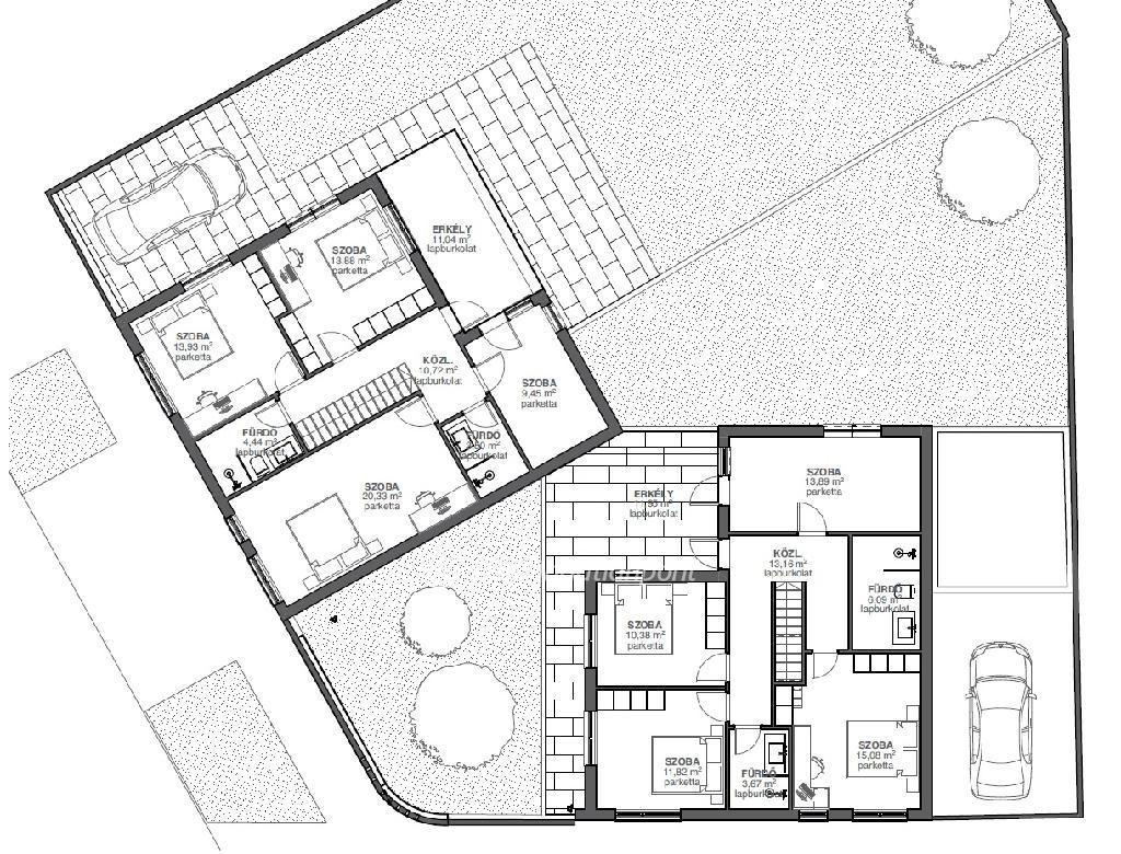 A kétszintes, garázsos ingatlan lakásonként 140 m2, 5 szoba, melyeket csak a két eladandó ingatlan minimálisan érintkezik Kertenként 301 m2 a bruttó területe.