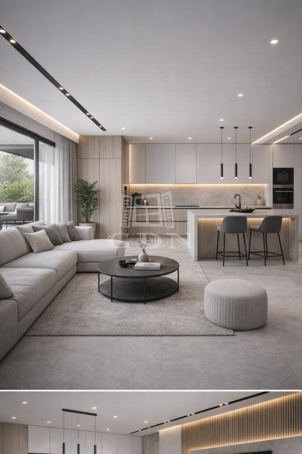 A modern elosztású ingatlan amerikai konyhás nappalival, 3 szobával, 2 fürdőszobával, dolgozósarokkal és külön háztartási helyiséggel rendelkezik 100 nm2-en.