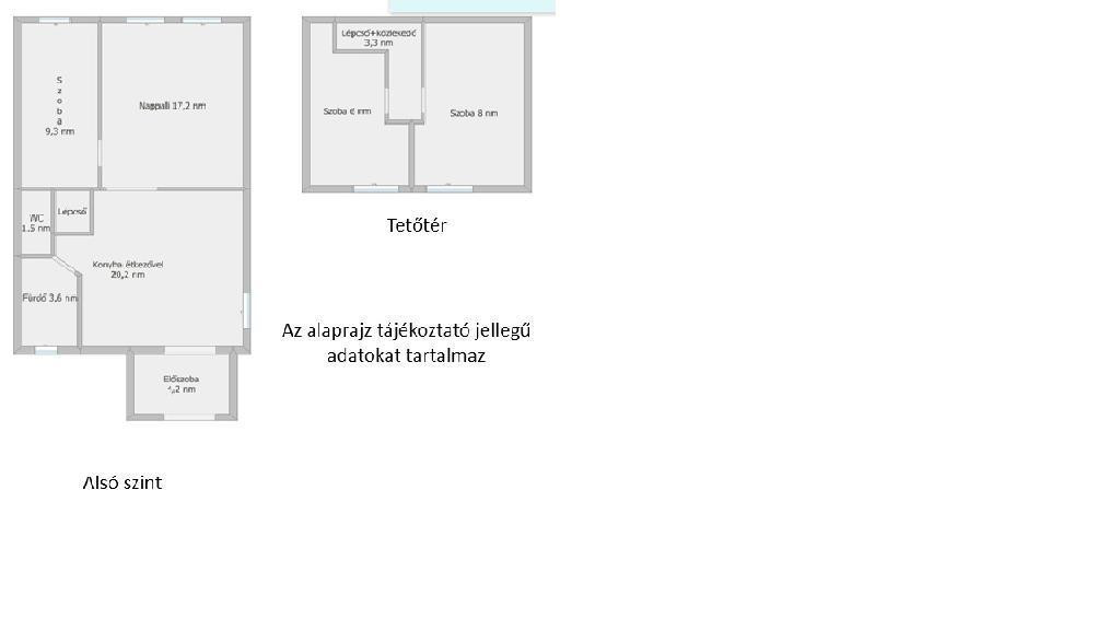 A tetőtérben kettő szoba kapott helyet, melyhez fa csigalépcső vezet fel az étkezőből.