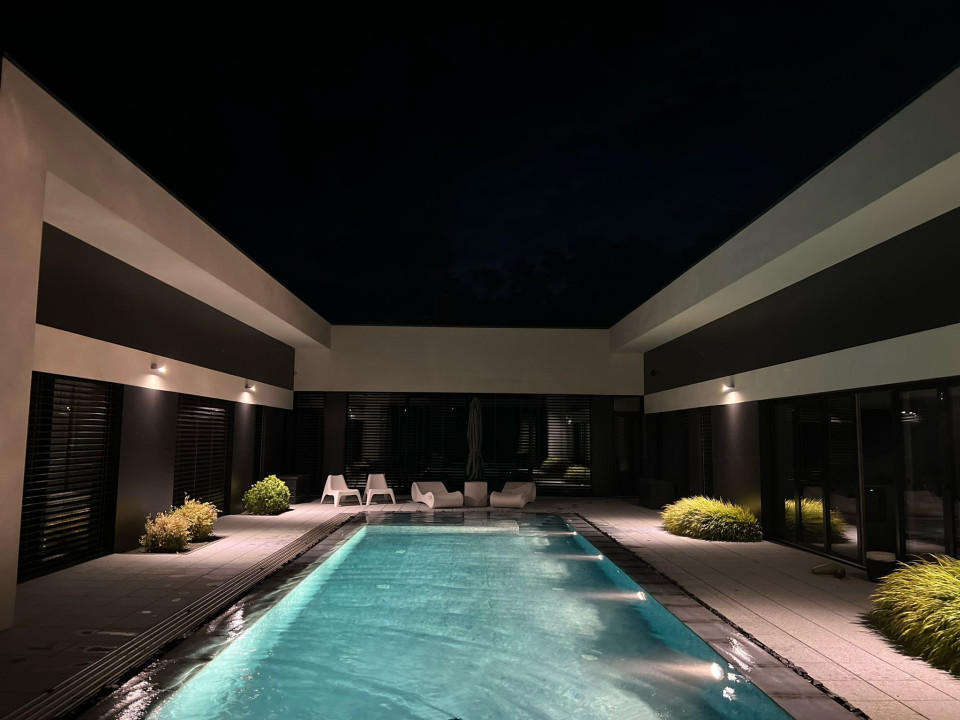 A tágas, napfényes nappali hatalmas üvegfelületekkel nyílik a kert felé, ahol a 12×4 méteres medence és a teraszról megközelíthető nyári konyha, közösségi helyiség biztosítja a tökéletes kikapcsolódást. A házban 3 kényelmes hálószoba, konyha étkezővel, kandalló, 3 WC, valamint zuhanyzós és kádas fürdőszoba egyaránt megtalálható.