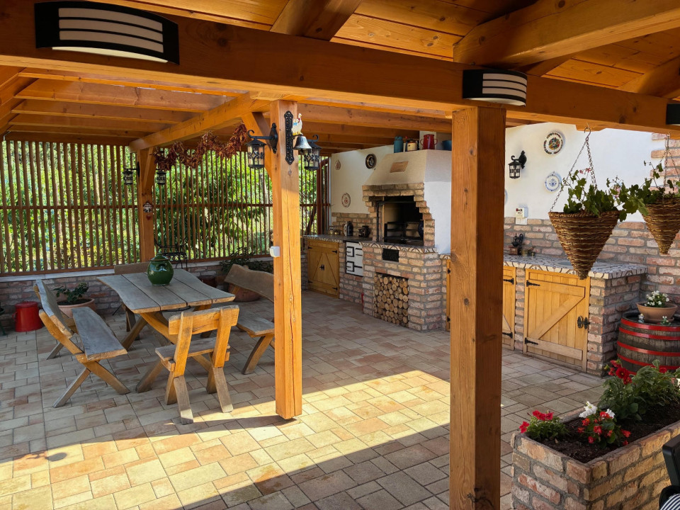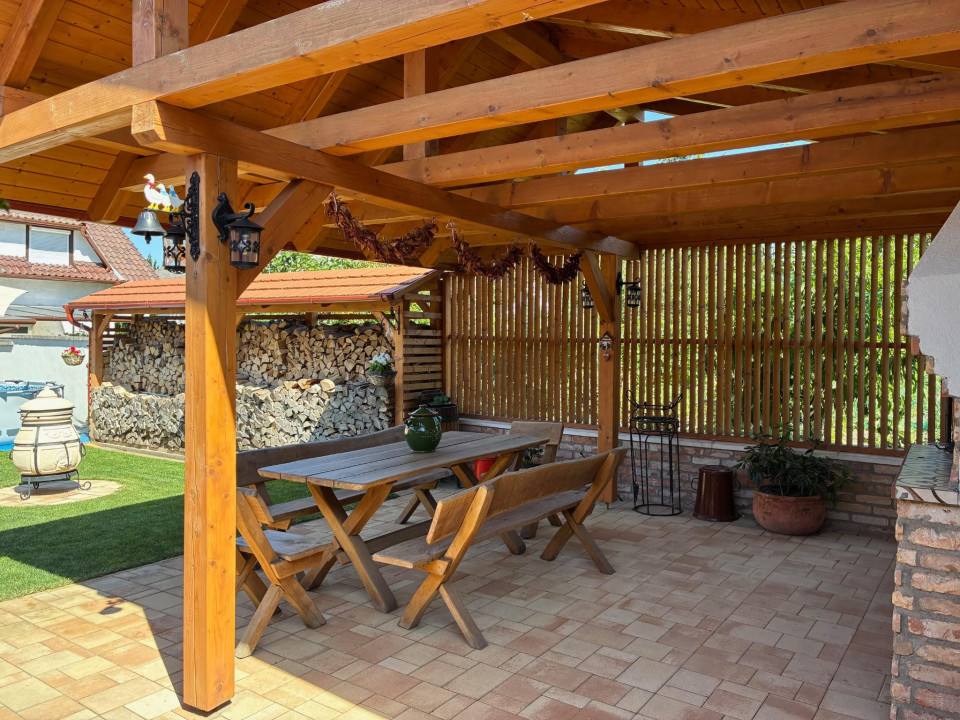 Az ingatlanhoz hozzá tartozik egy 526 m2-es telek, egy garázs (amelyben található egy külön helységben egy kinti wc, valamint elektromos autók töltéséhez nélkülözhetetlen 400v-os hálózat is), kerti konyha, illetve egy nyári pihenő, kiülő, kerti tusoló (RAVAK), valamint egy gondosan rendezett kert is, amelyben helyett kapott különlegesebb ételek elkészítésére szolgáló azerbajdzsáni amphora tandoor (váza kemence) is.