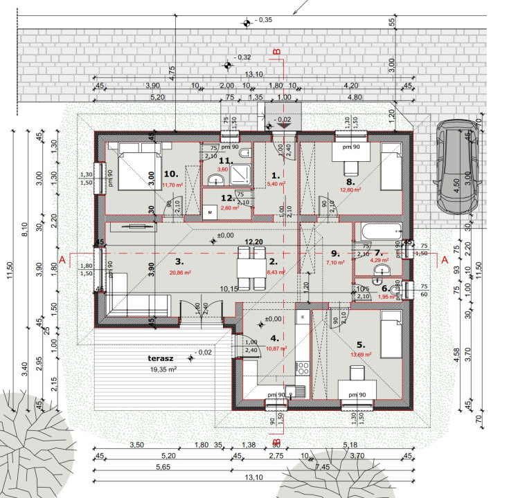 A helyiségek elrendezése a modern családok igényeihez igazodik: kényelmes, jól kihasználható terekkel, sok természetes fénnyel és közvetlen kertkapcsolattal.