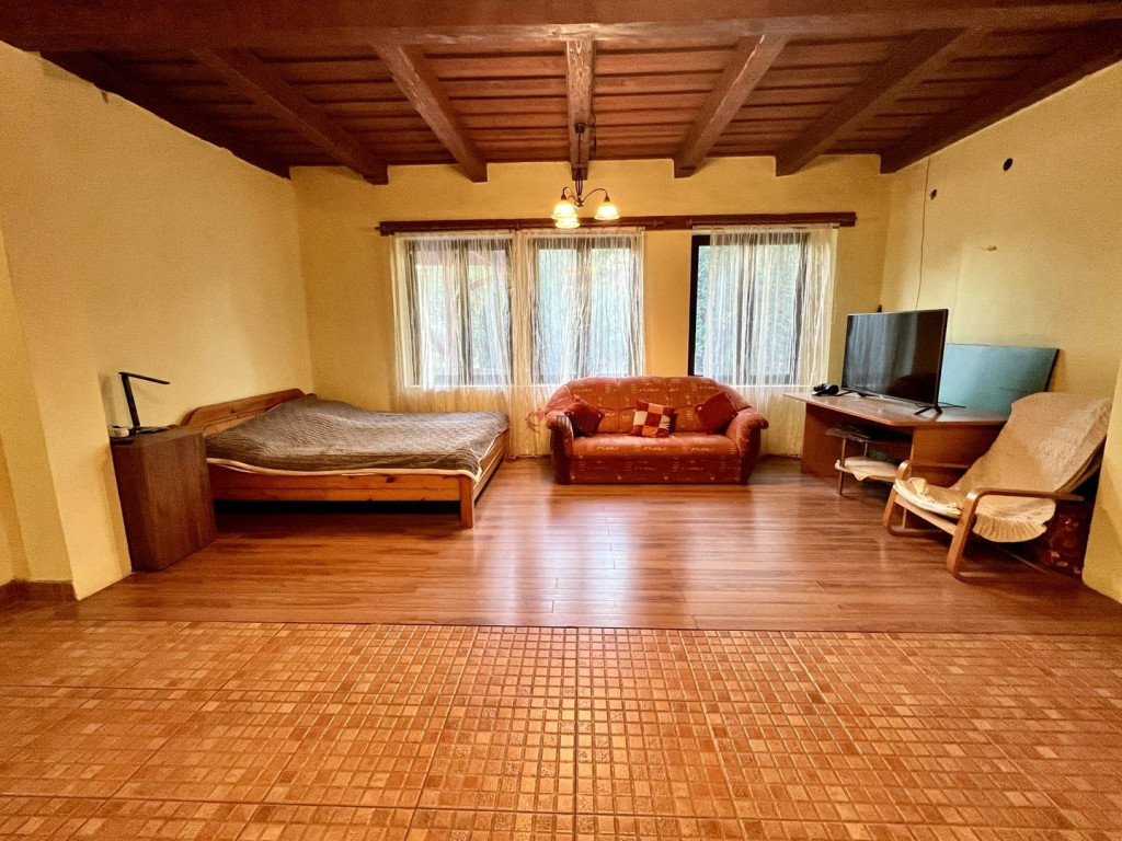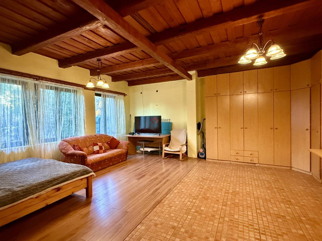 A 180 m2-es lakótér fele, azaz 90 m2 jelenleg is lakott, ezt a részt évekkel ezelőtt felújították. Elrendezése: óriási nappali + 1 háló, konyha-étkező, zuhanyzós fürdőszoba, előszoba. A látszó fagerendák meleg hangulatot adnak a belső térnek. A bejárat a tornácról nyílik, ahol kényelmesen elfér a kinti étkező garnitúra.
