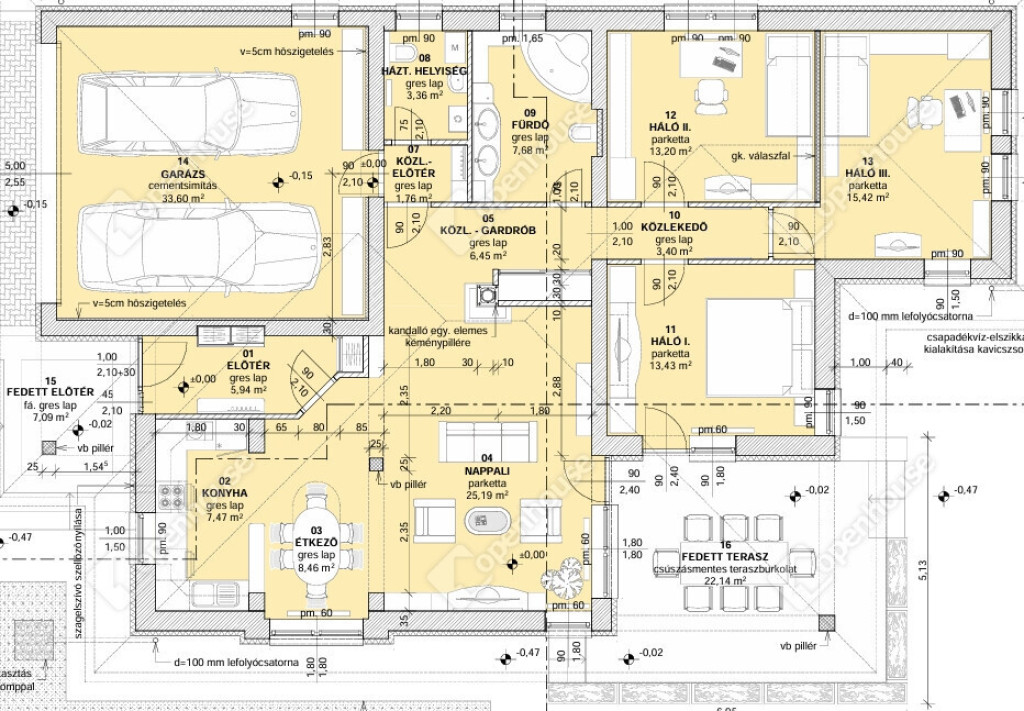 - A ház összesen 156 m2-es. Ebből 112 m2 lakótér ( hasznos alapterület), 33 m2 garázs és 30 m2 fedett terasz.