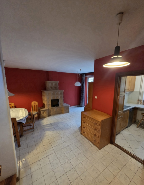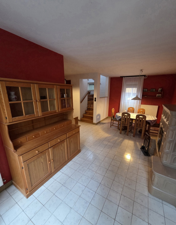 A szélfogóból balra lépve az otthon központi része tárul fel: az étkező és a nappali egy légtérben, kellemes arányokkal és bőséges természetes fénnyel. A nappali meghatározó eleme a nagy méretű cserépkályha, amely nemcsak hatékony fűtési alternatíva, hanem valódi otthonérzetet is ad. A nappaliból teraszon keresztül közvetlen kijárat nyílik a kertbe, így a belső és külső élettér természetes módon kapcsolódik össze.