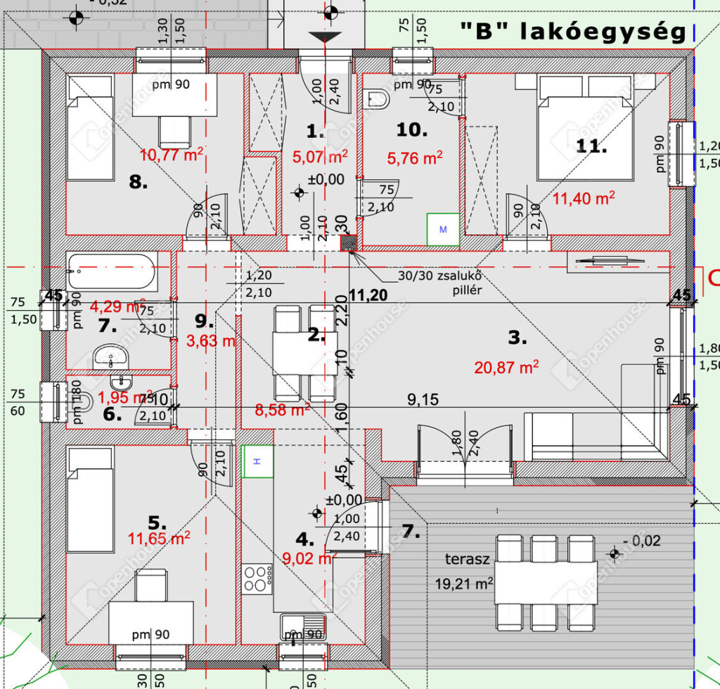 95 m²-es családi ház + 20 m² épített terasz kerámia burkolattal,