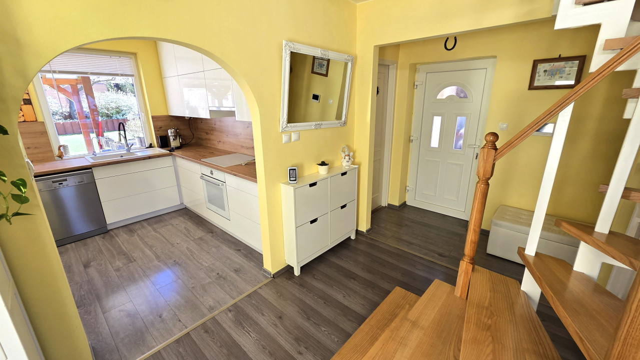 A házba belépve egy praktikus előszobába érkezünk, ahonnan továbbhaladva az amerikai konyhás nappali tárul elénk. Ez a tér valóban a ház központja: világos, tágas és barátságos hangulatú, ahol a családi élet természetes módon szerveződik. Ez a tér közvetlen kertkapcsolattal rendelkezik, így a belső és külső terek szinte egybeolvadnak – ideális választás mindennapi használatra, de akár vendégfogadásra is.