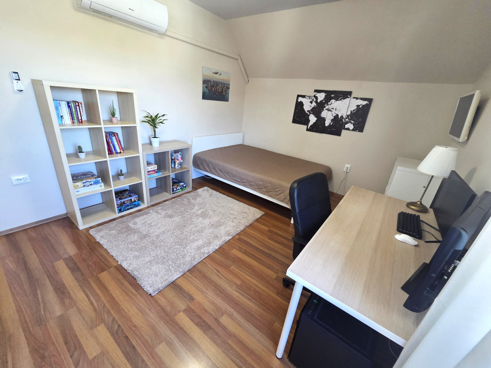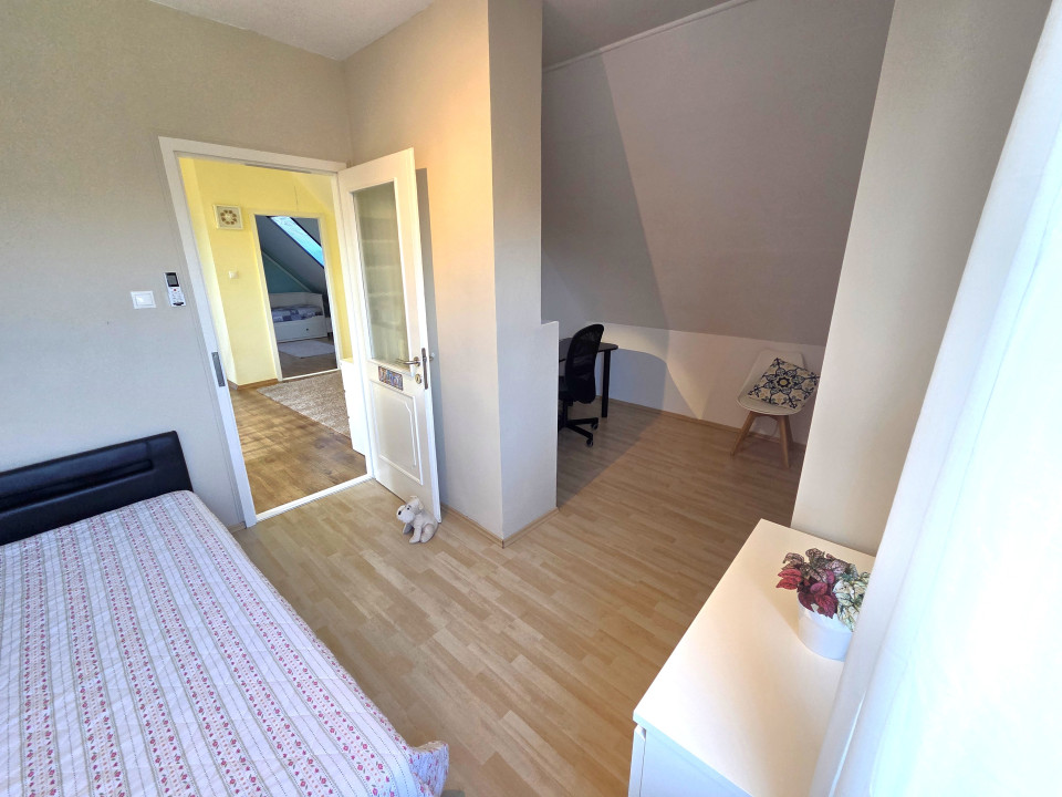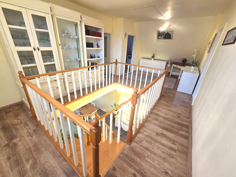 A földszinten a nappalin túl két kényelmes hálószoba, egy fürdőszoba, valamint egy külön háztartási helyiség kapott helyet, biztosítva a praktikus és jól elkülönülő élettereket. Az emeletre vezető lépcső egy központi térbe érkezik, ahol egy dolgozósarok került kialakításra – tökéletes otthoni munkavégzéshez vagy tanuláshoz. Ezen a szinten további három szoba és egy fürdőszoba található, így nagyobb család számára is kényelmesen használható.
