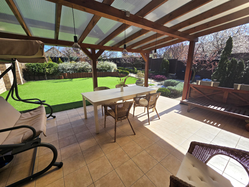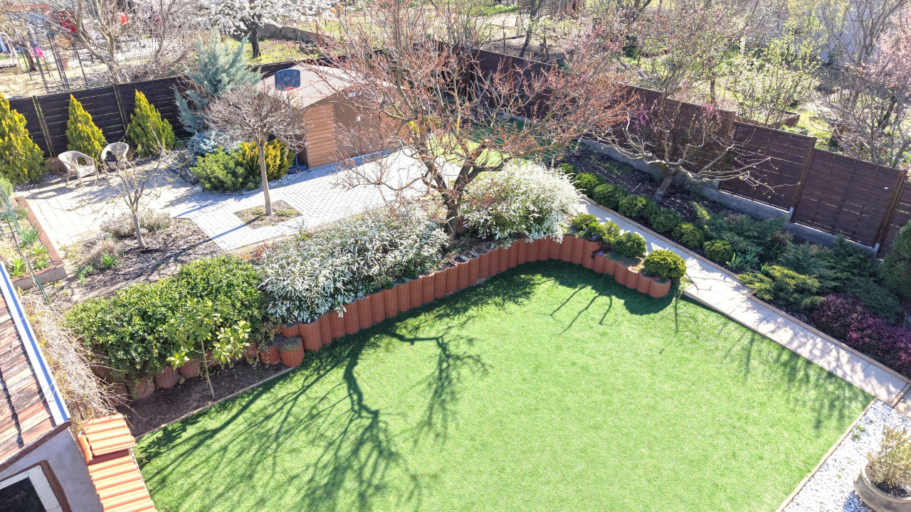 A parkosított kert és a fedett terasz tökéletes helyszínt biztosít családi eseményekhez, baráti összejövetelekhez vagy egyszerűen a mindennapi kikapcsolódáshoz. A telken egy különálló kisebb ház, valamint kerti tároló is megtalálható, ami tovább növeli a praktikumot. A ház előtt, de a telken belül kialakított térkövezett autóbeálló akár 4 autó kényelmes parkolását is lehetővé teszi.