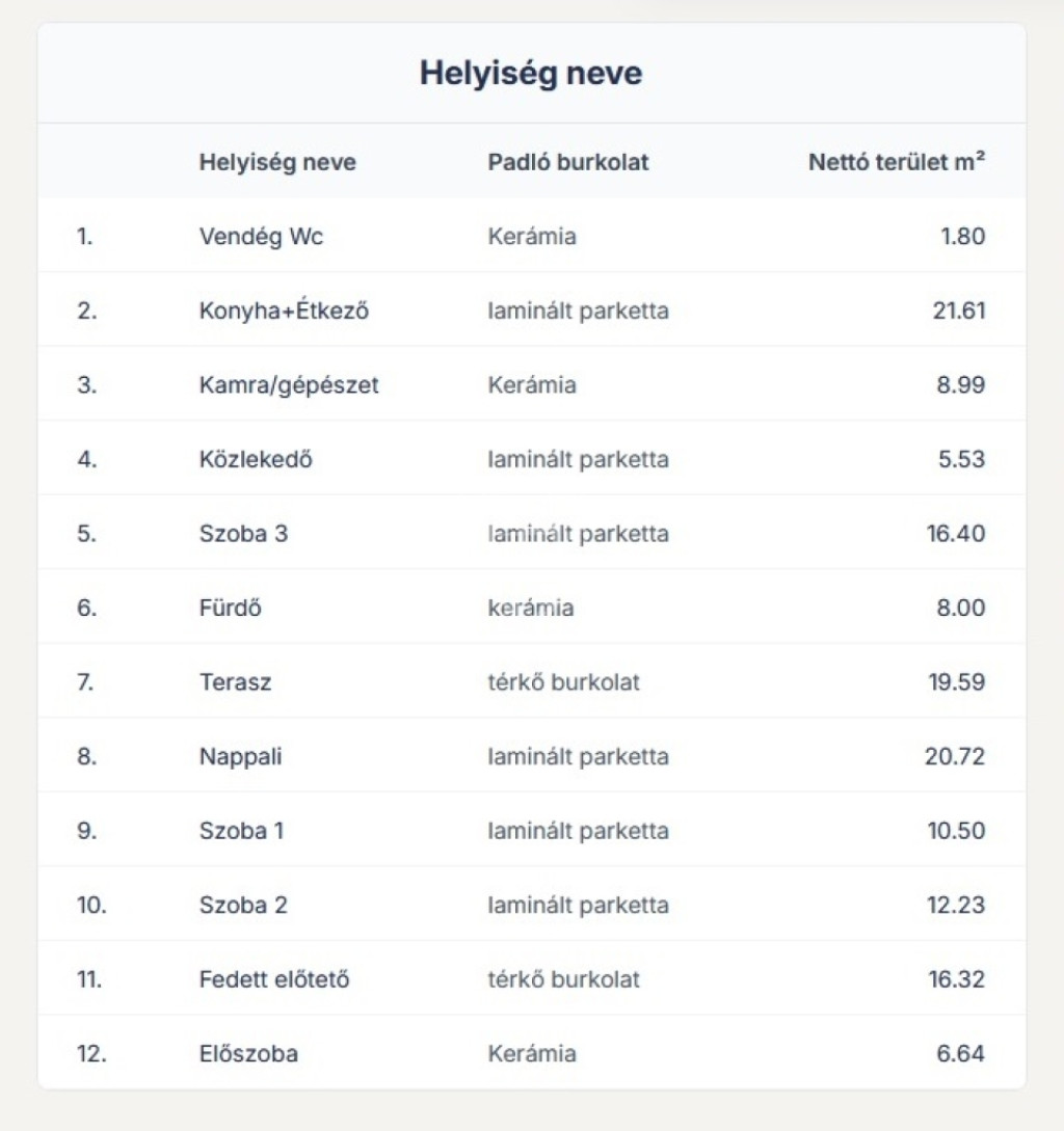 A ház központi életterét egy világos, egybefüggő nappali–étkező–konyha alkotja, amely közvetlen kapcsolatban áll a nagyméretű terasszal, így a belső és külső terek harmonikusan összekapcsolódnak. A bejárat az előszobába vezet, ahonnan külön vendég WC, valamint gardróbbal ellátott közlekedő nyílik. A konyhához közvetlenül kapcsolódik egy külön háztartási és gépészeti helyiség, amely a mindennapi életet kényelmesebbé és rendezettebbé teszi. Az előszobából induló közlekedő egy elkülönített privát zónába vezet, ahol 3 hálószoba, valamint egy zuhanyzós fürdőszoba található, amely igény szerint káddal is bővíthető.