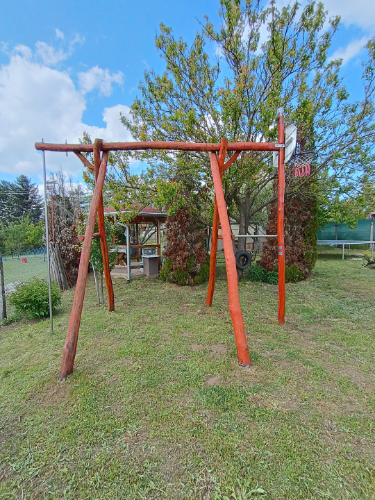 Udvar: lugas, grillező, napernyő, kiülő-8 személyes asztallal, trambulin, kerti hinta, gyerek mászóka: gyűrű, mászókötél, csőmászó, nyújtó, kosár palánk.