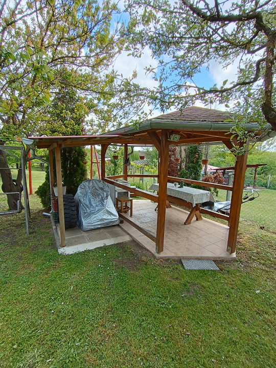 1844m2-es telek, körülkerített, 2 db. autóbeállóval rendelkezik (ebből az egyik lugas alatt található).