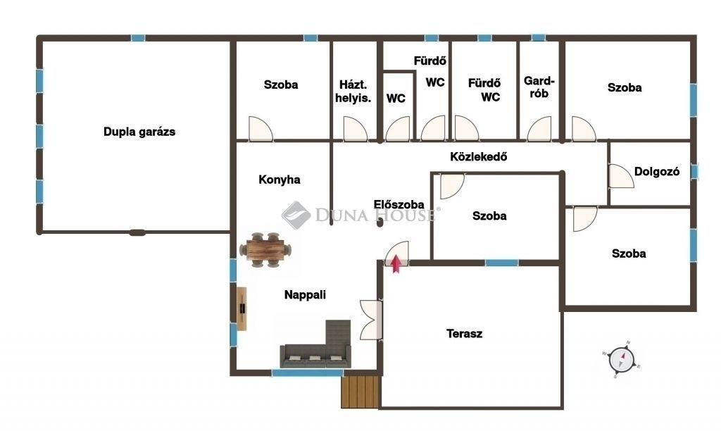 A tágas nappaliból közvetlen kijárat nyílik a nagy teraszra, amely tökéletes helyszínt kínál pihenéshez, családi vagy baráti összejövetelekhez. A dupla garázs kényelmes parkolást biztosít két autó számára, a nagy méretű, önálló telek pedig lehetőséget ad kert, játszóterület vagy akár kerti sütögető kialakítására is.