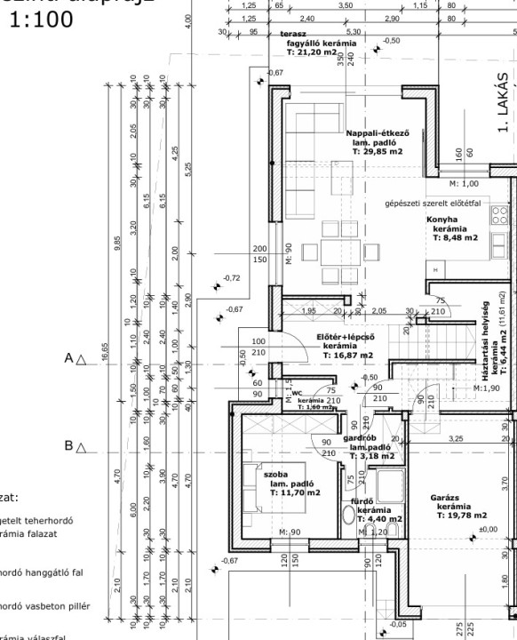 Földszint nm: 82,51 nm, emelet 49,49 nm gépkocsitároló, 19,78 nm terasz 21,2 nm