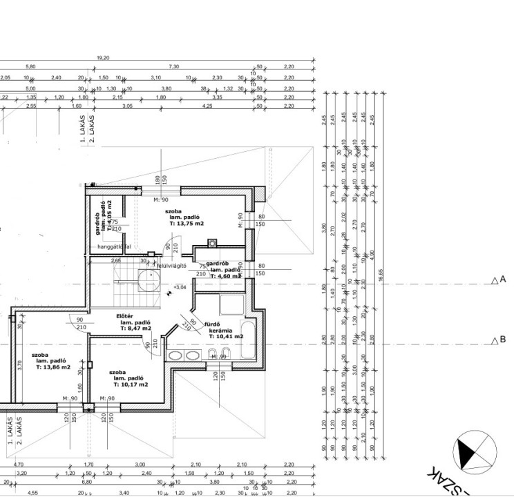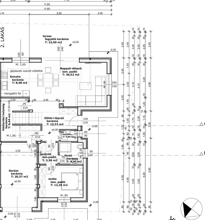 Földszint nm: 82,51 nm, emelet 49,49 nm gépkocsitároló, 19,78 nm terasz 21,2 nm