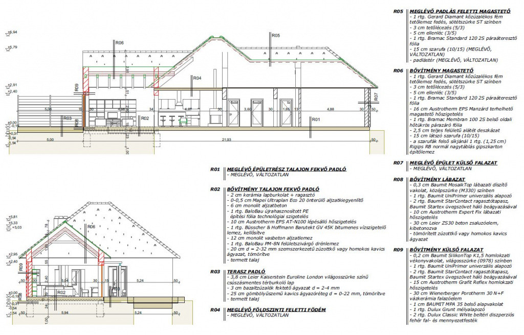 Falazat porotherm30 téglából, 20 cm hőszigeteléssel készült. 3 rétegű üvegek, elektromos redőnnyel és rovarhálóval ellátott nyílászárók Tető cserépfedéssel.