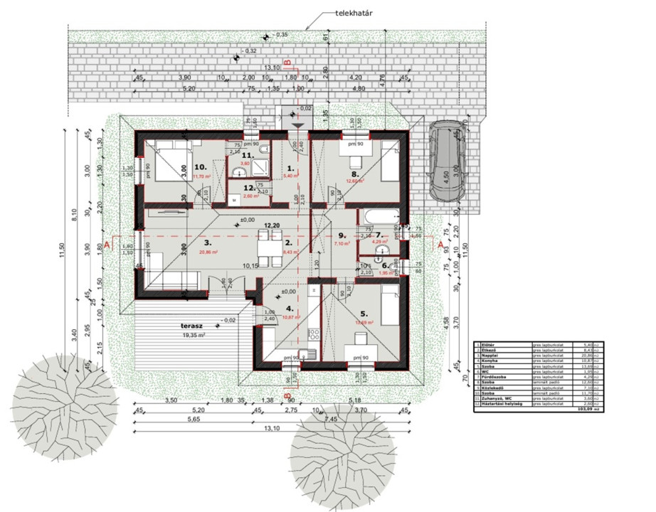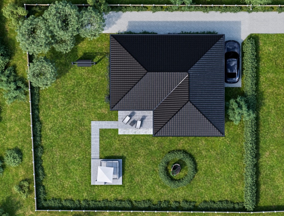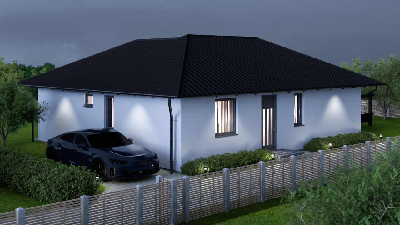 A helyiségek elrendezése a modern családok igényeihez igazodik: kényelmes, jól kihasználható terekkel, sok természetes fénnyel és közvetlen kertkapcsolattal.