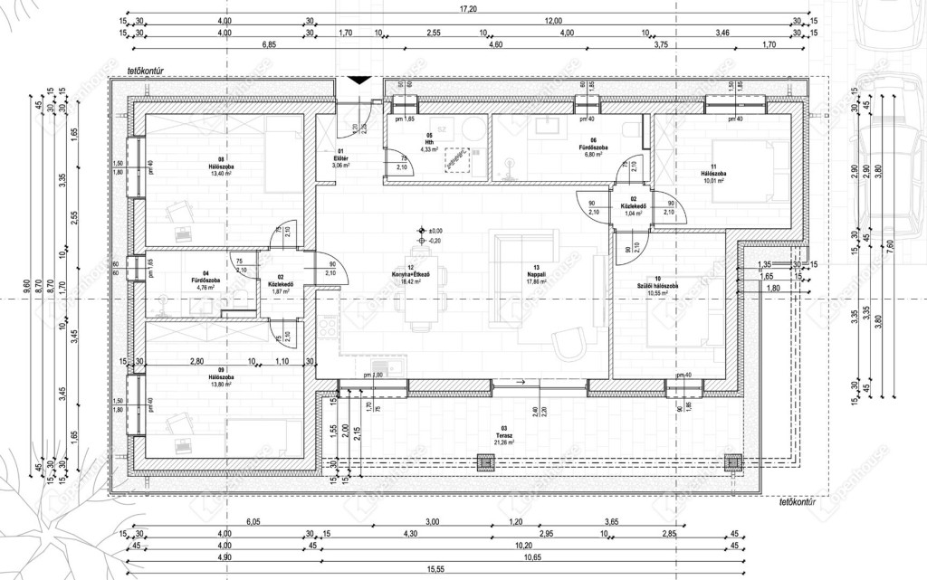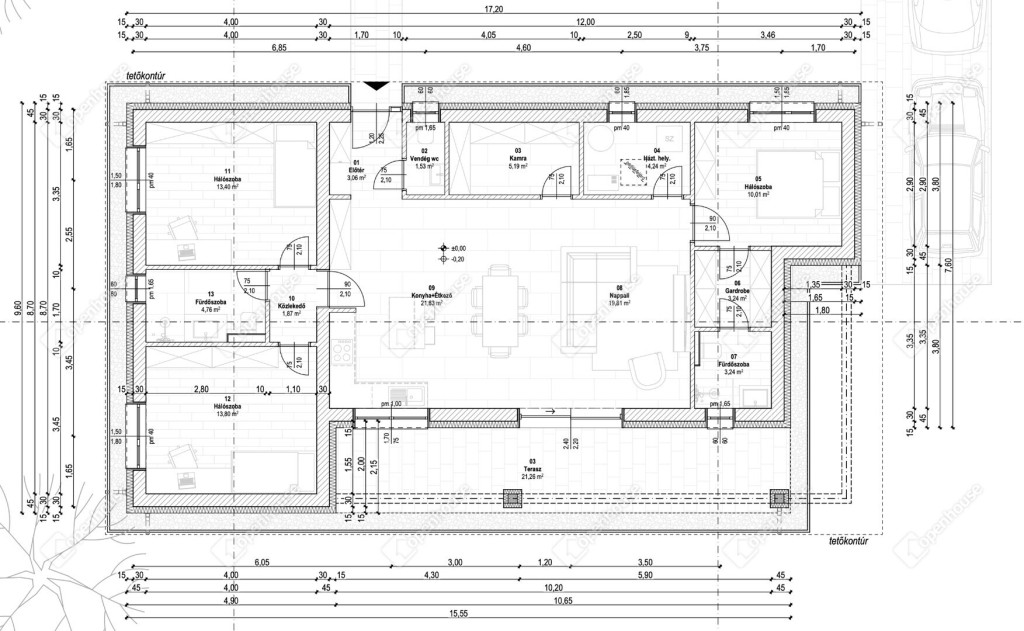 AZ INGATLANRÓL: Az ingatlan minőségi alapanyagok felhasználásával és a modern technológia alkalmazásával készül, a lehető legmagasabb színvonalon, modern megjelenéssel. A nettó alapterület 106m2, ami magába foglal egy hatalmas amerikai konyhás nappalit, 3 hálószobát, 2 fürdőszobát WC-vel, egy vendég WC-t, egy gardróbot és egy háztartási helyiséget. Továbbá az ingatlanhoz tartozik egy 21m2-es fedett terasz, egy 30m2-es térkövezett kocsibeálló, és egy saját használatú 740m2-es telek is. Az ingatlan a látványtervel megegyezően lesz kialakítva.