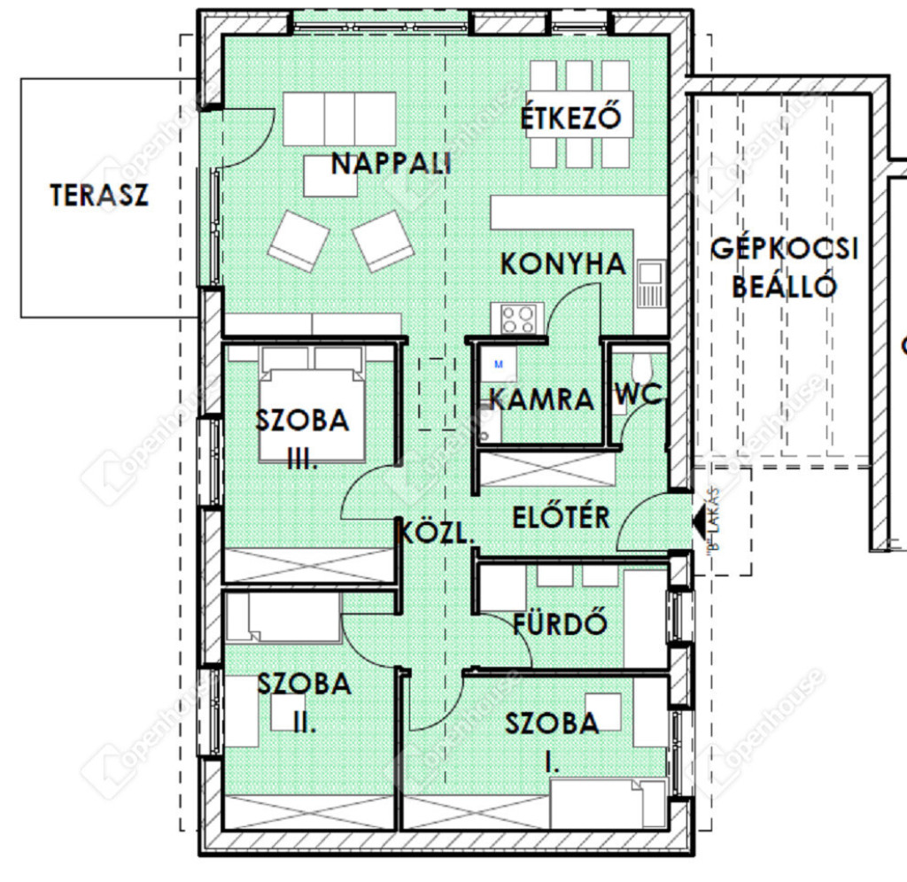 - 96,83 nm-es ikerház + 12 nm terasz + 18,9 gépkocsibeálló