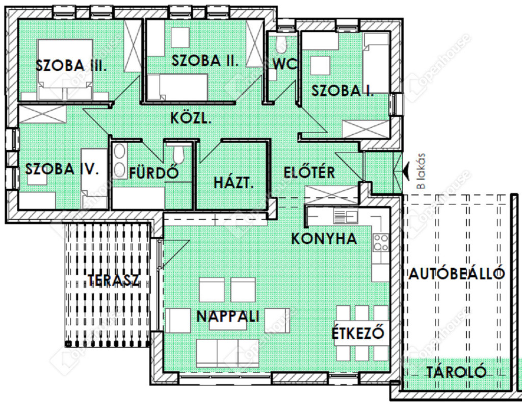 - 4 szoba + nappali elosztású, ezen felül 1 fürdő, háztartási helyiség, wc lett kialakítva