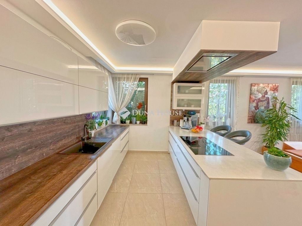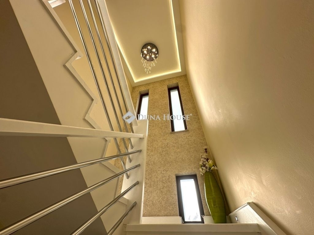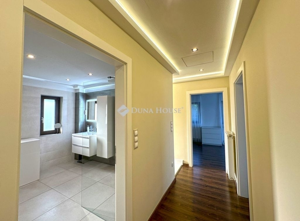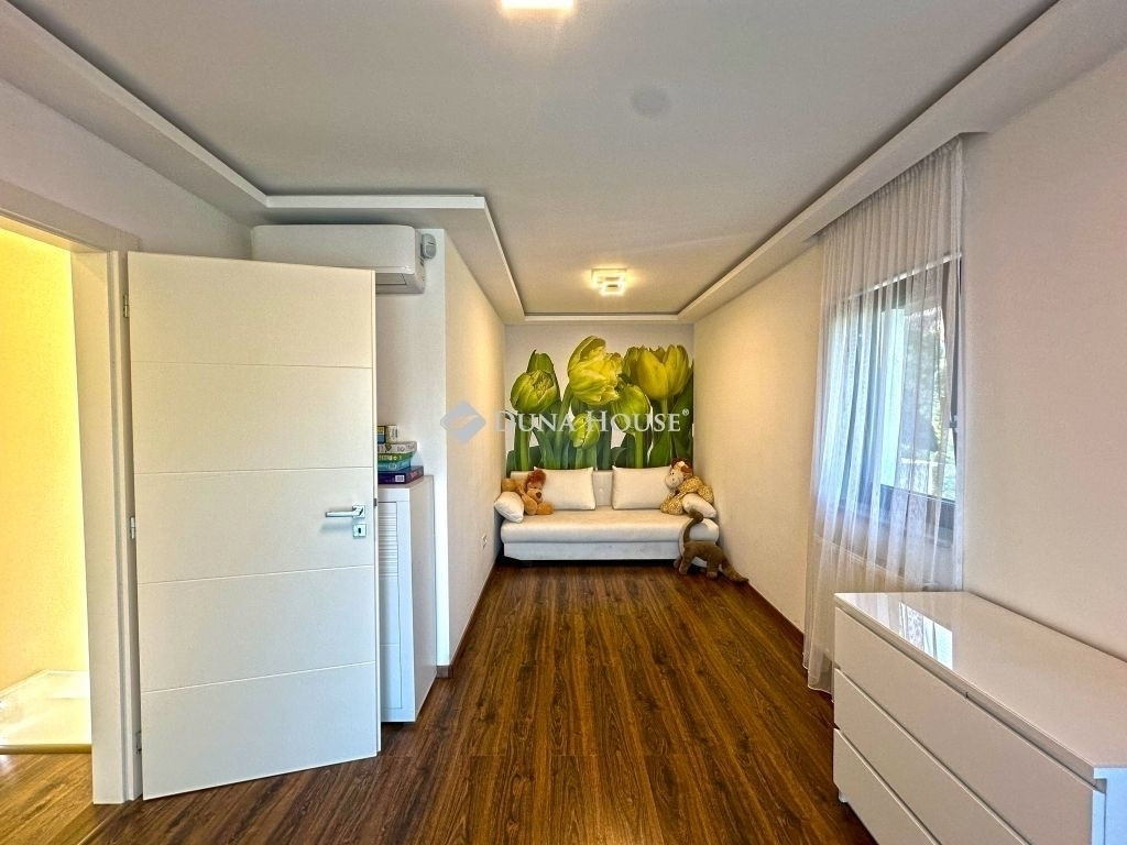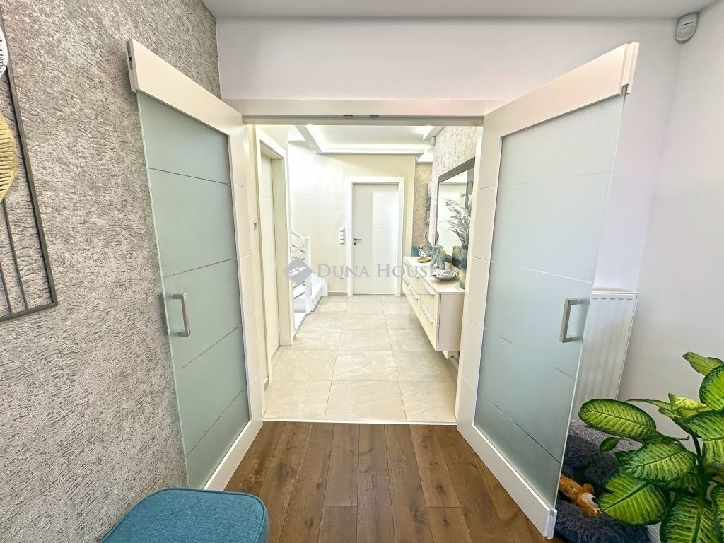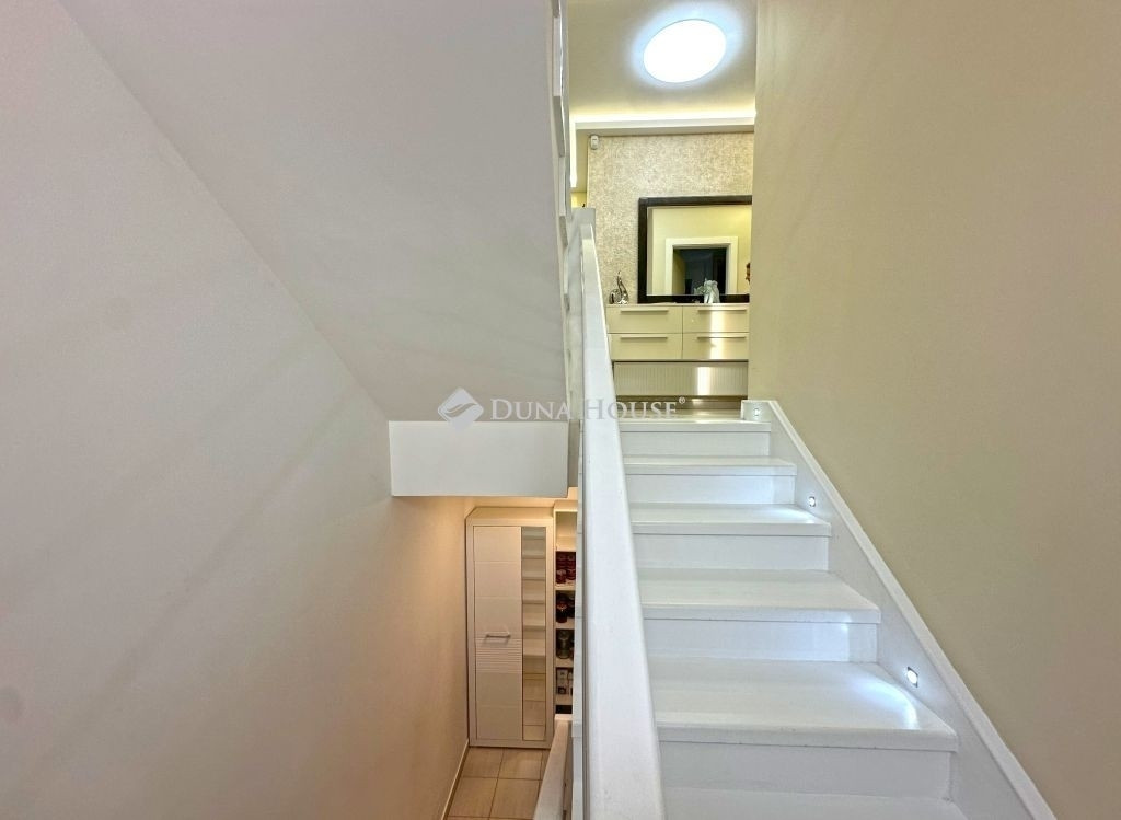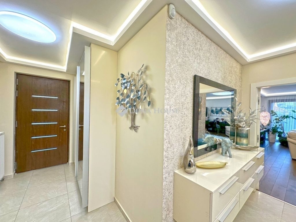 A földszinten egy 24 m²-es, az emeleten pedig egy 51 m²-es egybefüggő, üvegkorlátos terasz található. A 2022-ben kialakított belső térben egy hatalmas nappalit, négy hálószobát, egy gardróbszobát, külön konyhát és étkezőt, továbbá két fürdőszobát illetve két különálló WC/mosdót találunk. A garázsszinten mosókonyha, gépészti helyiség, tároló/szoba, valamint előszoba kapott helyet. Ezen a szinten található az egyik külön mosdó is.