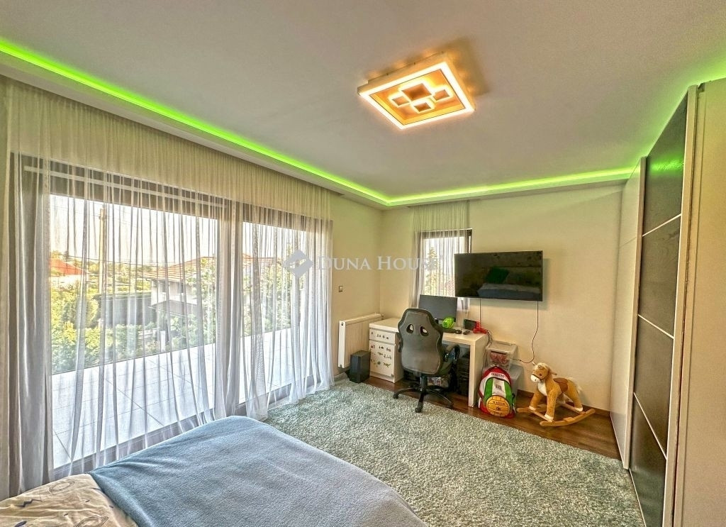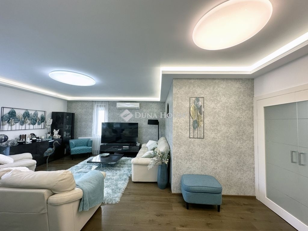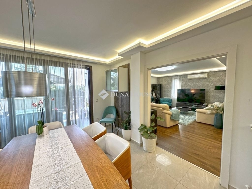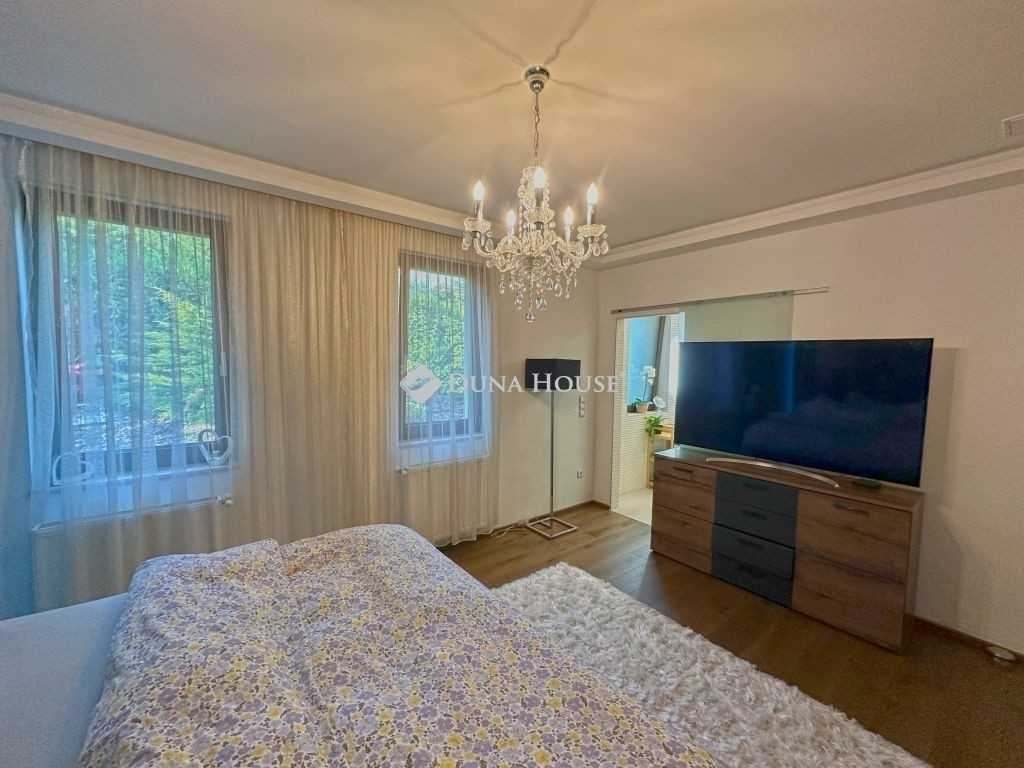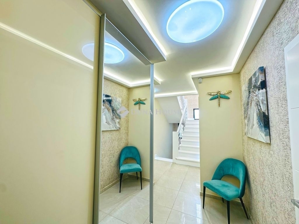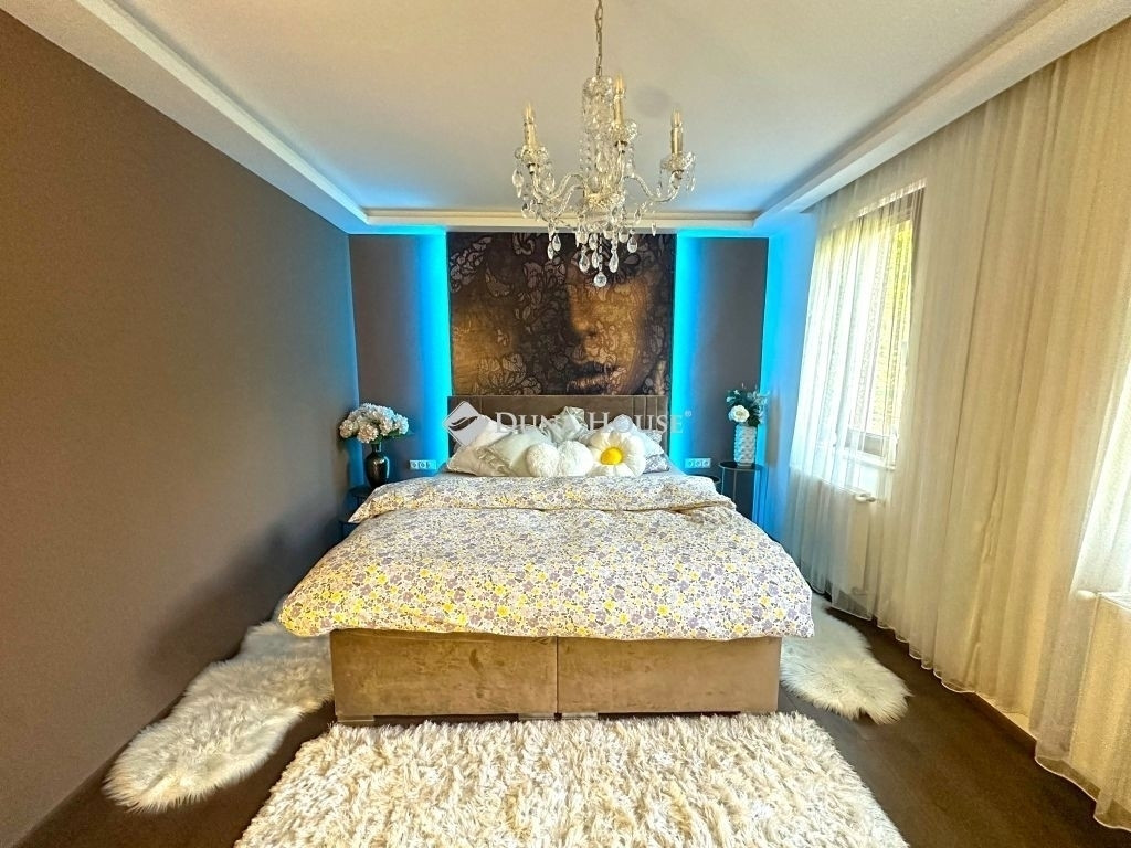 A földszinten egy 24 m²-es, az emeleten pedig egy 51 m²-es egybefüggő, üvegkorlátos terasz található. A 2022-ben kialakított belső térben egy hatalmas nappalit, négy hálószobát, egy gardróbszobát, külön konyhát és étkezőt, továbbá két fürdőszobát illetve két különálló WC/mosdót találunk. A garázsszinten mosókonyha, gépészti helyiség, tároló/szoba, valamint előszoba kapott helyet. Ezen a szinten található az egyik külön mosdó is.