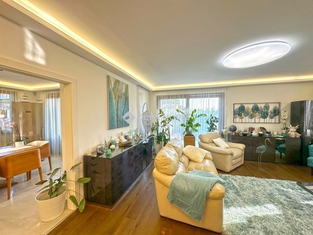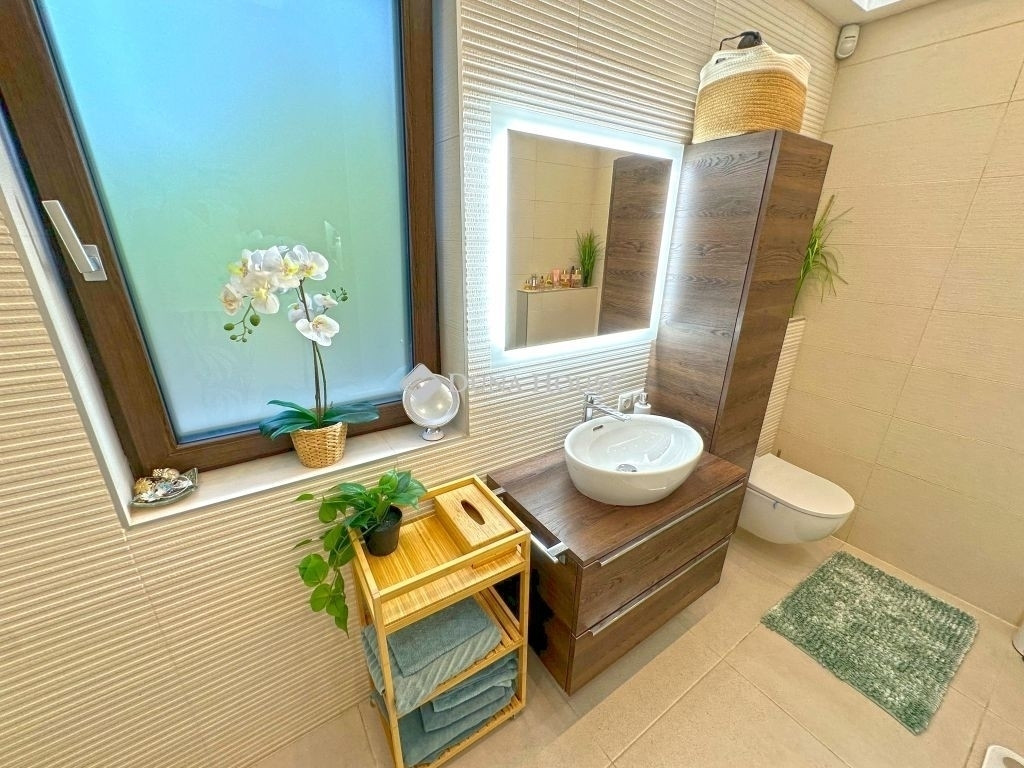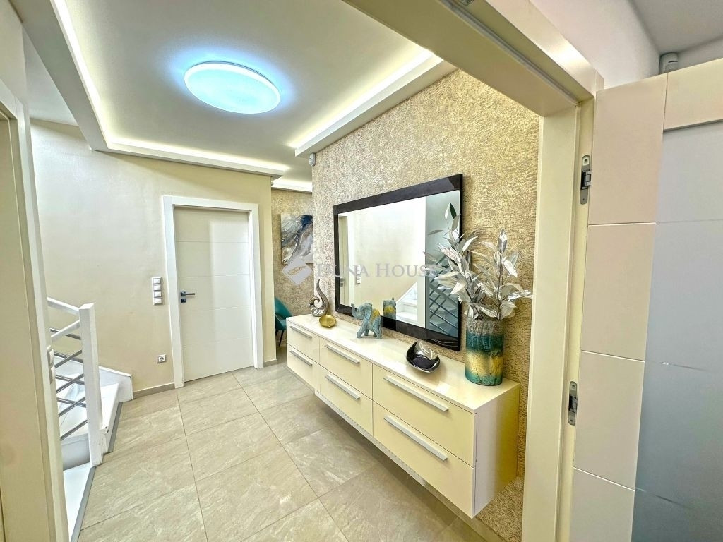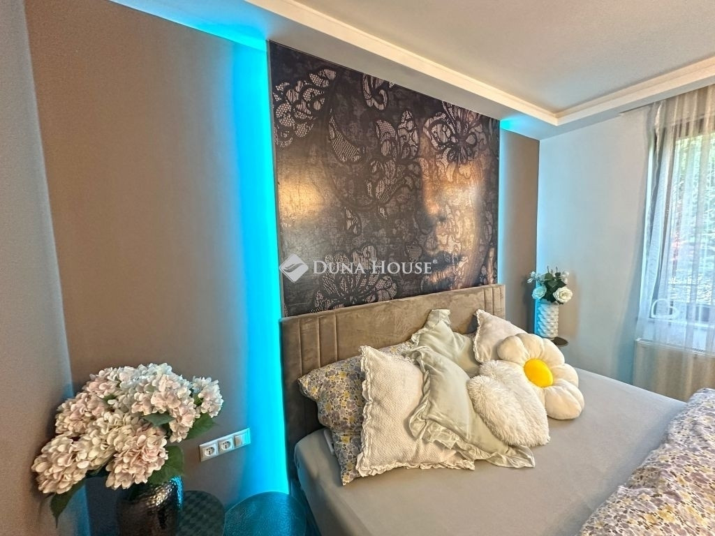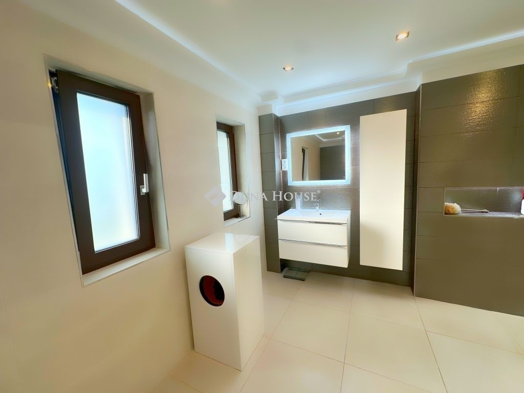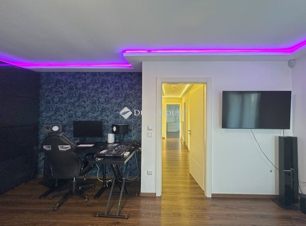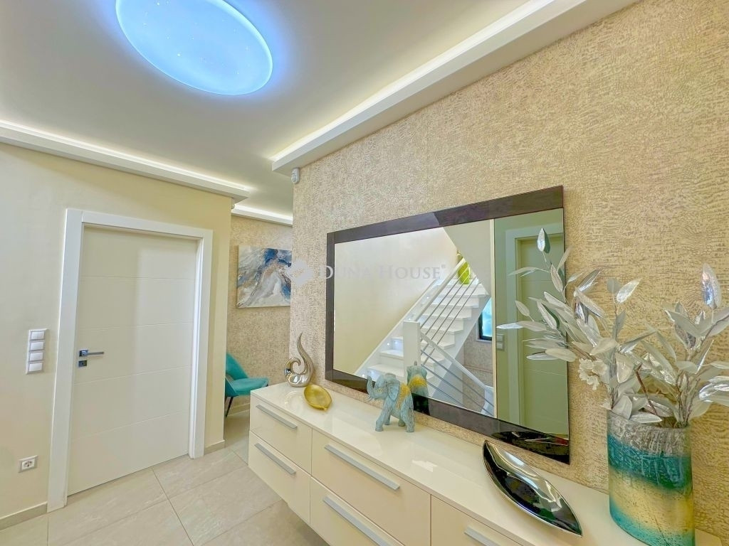 A földszinten egy 24 m²-es, az emeleten pedig egy 51 m²-es egybefüggő, üvegkorlátos terasz található. A 2022-ben kialakított belső térben egy hatalmas nappalit, négy hálószobát, egy gardróbszobát, külön konyhát és étkezőt, továbbá két fürdőszobát illetve két különálló WC/mosdót találunk. A garázsszinten mosókonyha, gépészti helyiség, tároló/szoba, valamint előszoba kapott helyet. Ezen a szinten található az egyik külön mosdó is.