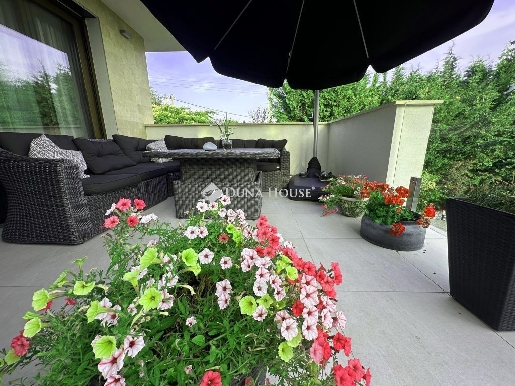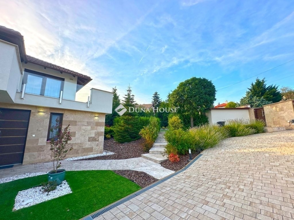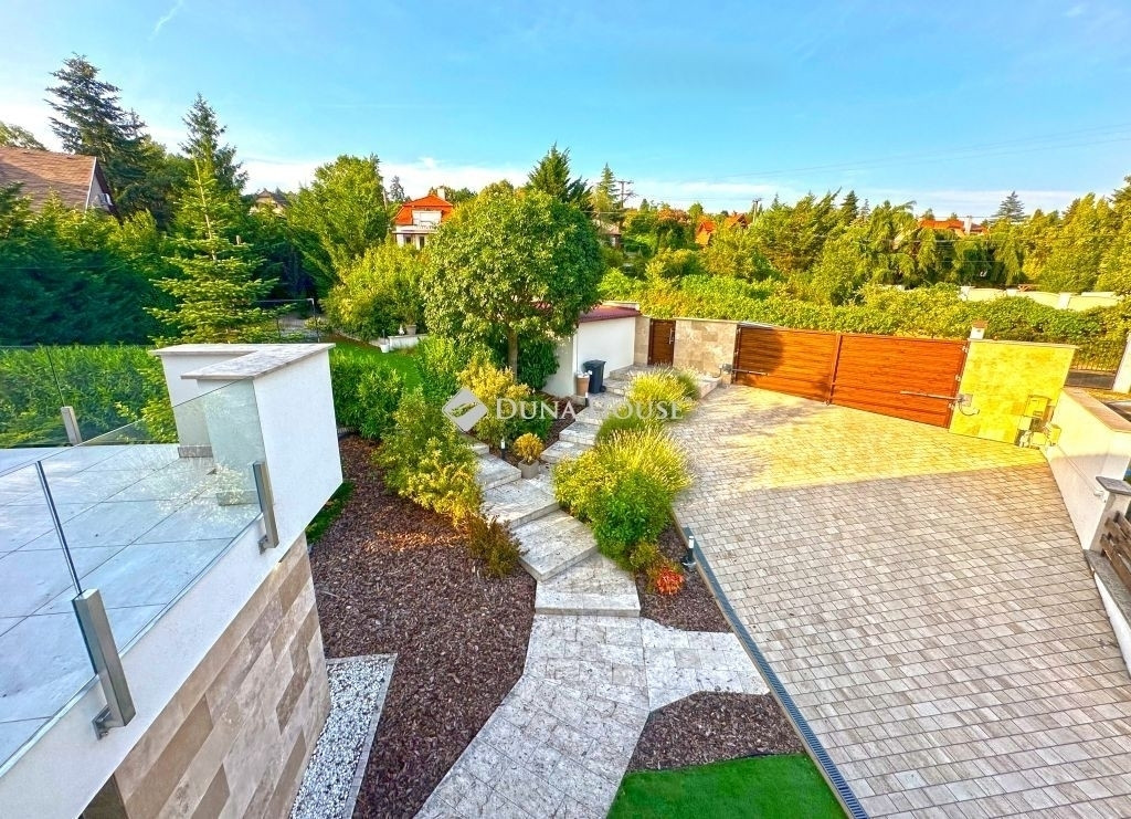Öntözőrendszerrel ellátott 889 m²-es telek, ami igény szerint kibővíthető 1199 m²-re. Örökzöldekkel parkosított intim kert, holland pázsit, mészkő járólapok, 5 személyes Wellis jacuzzi biztosítja a felfrissülő pihenést.