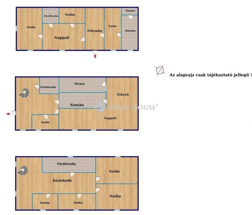 Elosztása: nappali, 2 szoba, étkező, konyha, kamra, gardrób, fürdő, WC, közlekedő, saját kertkapcsolat.