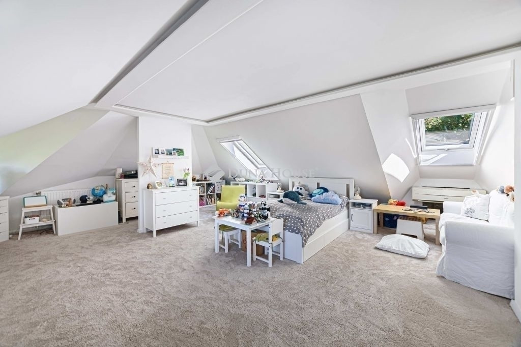 Az alsó szinten a kiszolgáló helyiségek mellett egy exkluzív wellness részleg várja a ház lakóit finn szaunával felszerelve. A nappali szintjén étkező-konyha-nappali, valamint két szoba kapott helyet, míg a legfelső szint jelenleg egy különleges atmoszférájú tágas gyermekszobának ad otthont, azonban a térelrendezés lehetőséget biztosít további két szoba kialakítására is.