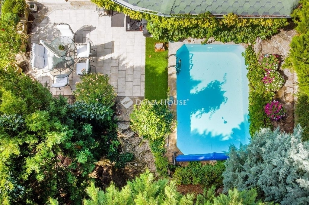 A kertben kültéri medence gondoskodik a nyári felfrissülésről, míg a telek végében egy hangulatos egyszobás rönkház kínál meghitt menedéket szinte az erdő ölelésében.