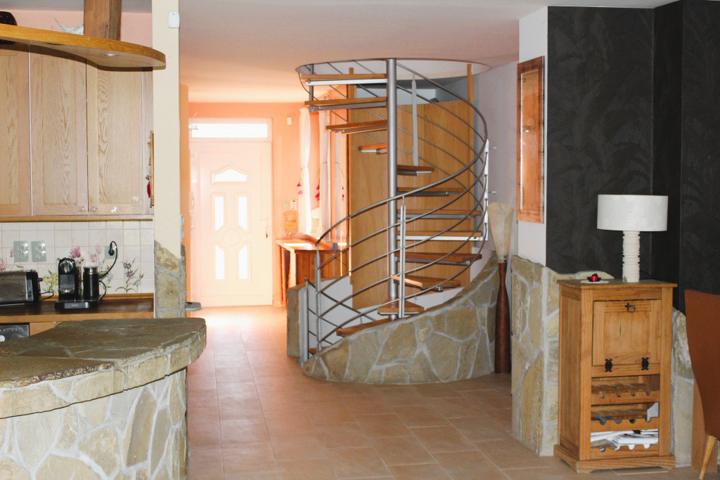 A földszint tágas, világos, különleges hangulatú amerikai konyhás nappali és étkező került kialakításra, egyedi megjelenésű burkolatokkal és kandalló kialakításának lehetőségével. Ezen a szinten további helyiségek is találhatók. Kamra, külön fürdőszoba, wc, egy hálószoba, és egy mosókonyha-gardrób, ami akár dolgozószobaként is használhatók vagy vendégszobaként is használható. A nappaliból közvetlen kijárat nyílik a nagy, részben fedett teraszokra, és az intim kertre.