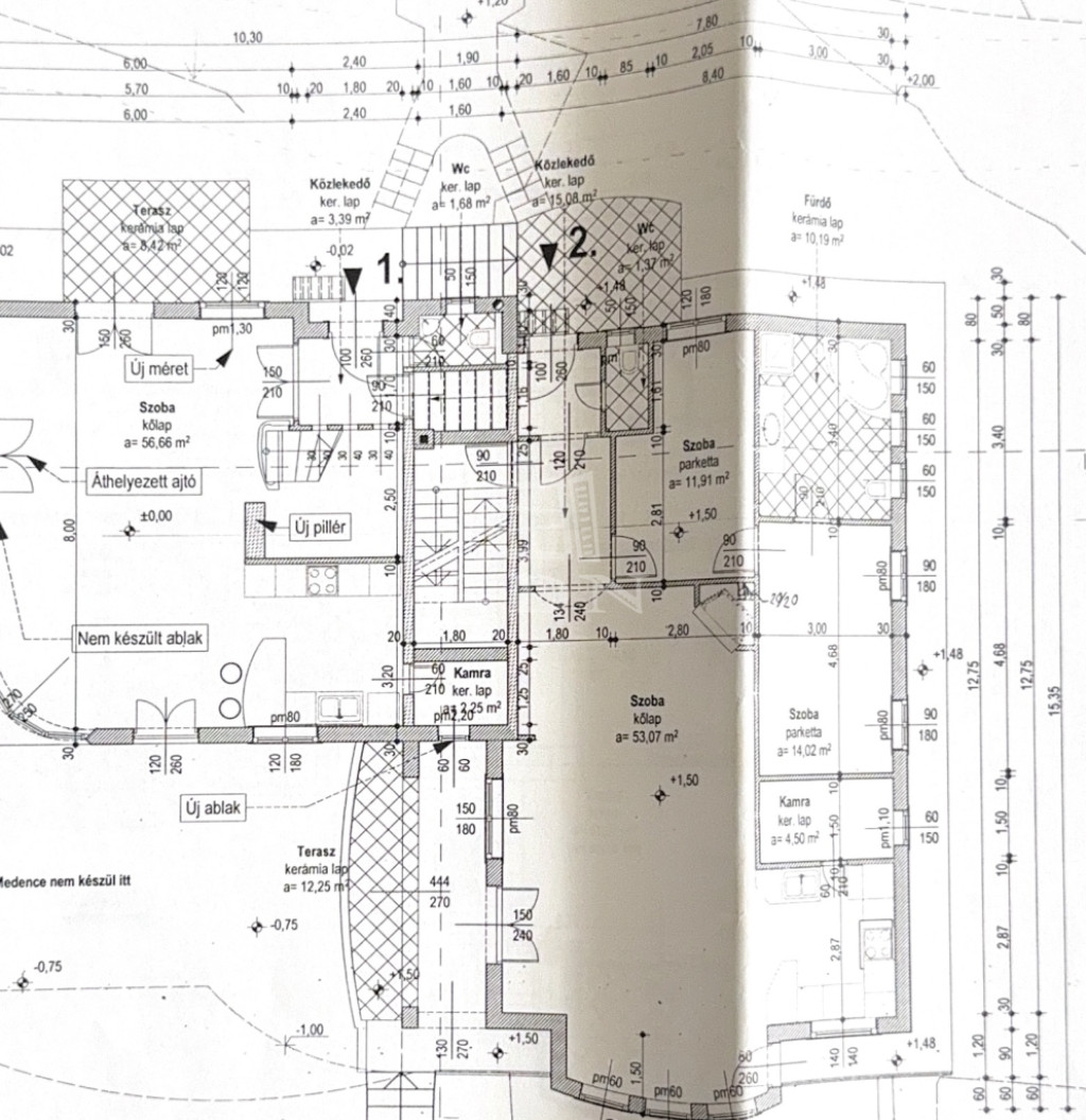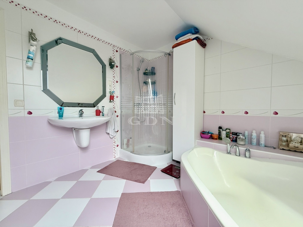 Az emeleti szint egy külön világ: tágas terek, több szoba és egy nagyméretű terasz, ahonnan lenyűgöző panoráma nyílik Szentendrére és a környező dombokra. Ez a lakás akár teljesen önállóan is használható, hosszabb távú bérbeadásra is alkalmas.