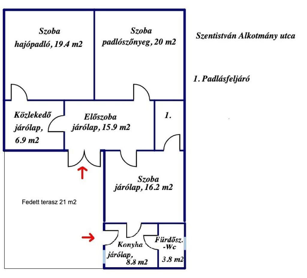 Megvételre kínálok SZENTISTVÁN központjában, az ALKOTMÁNY ÚTON egy 3 SZOBÁS, 95 M2 HASZNOS ALAPTERÜLETŰ VÁLYOG CSALÁDI HÁZAT, amely praktikus belső elrendezésének és hangulatos részleteinek köszönhetően kiváló OTTHON lehet. Az ingatlanban előszoba, két konyha, közlekedő, spejz, PADLÁSFELJÁRÓ, valamint egy AGYLÉGTERŰ FÜRDŐSZOBA-WC található. A bejáratnál egy 21 M2-ES FEDETT TERASZ teszi teljessé a kényelmet, amely ideális helyszíne lehet a reggeli kávézásnak vagy a délutáni pihenésnek. A FŰTÉS GÁZKONVEKTORRAL, a MELEGVÍZ ellátás VILLANYBOJLERREL megoldott.