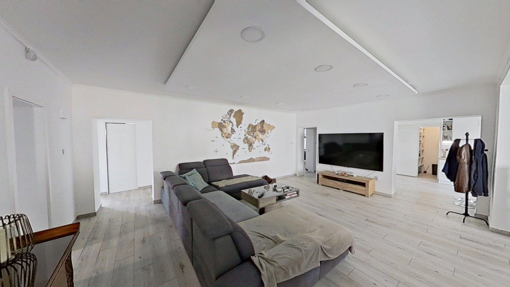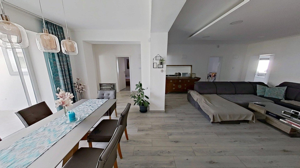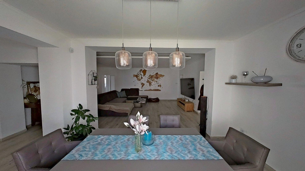 A ház elosztása jól átgondolt, egy nagyobb család számára is komfortos. A központban természetesen a hatalmas nappali/étkező van, de a hálószobák mind külön nyílnak, és több fürdőszoba is rendelkezésre áll a ház távolabbi pontjain.