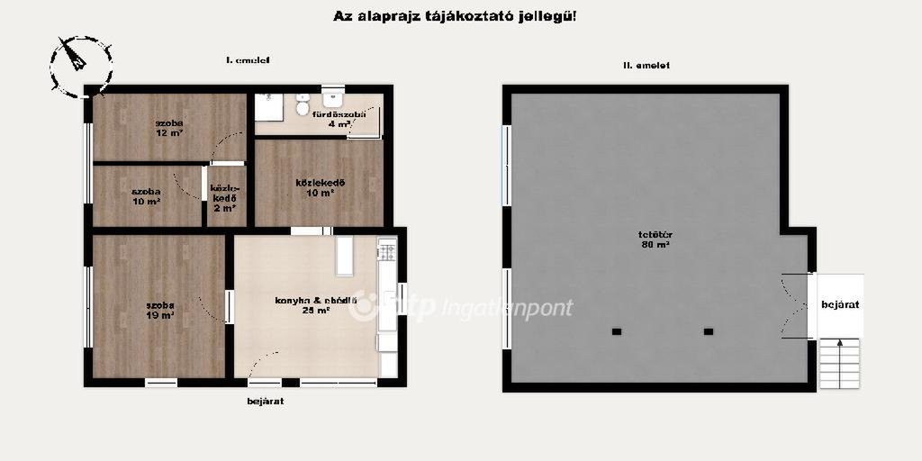 A házba belépve egy tágas tér fogad minket, ahol a konyha és étkező egy nyitott családi teret alkot. Innen nyílik egy nagyszoba, valamint a közlekedő, amelyről a fürdőszoba és egy további nagyszoba érhető el.
