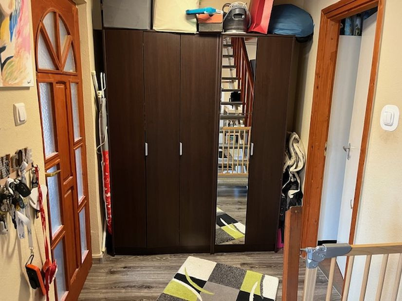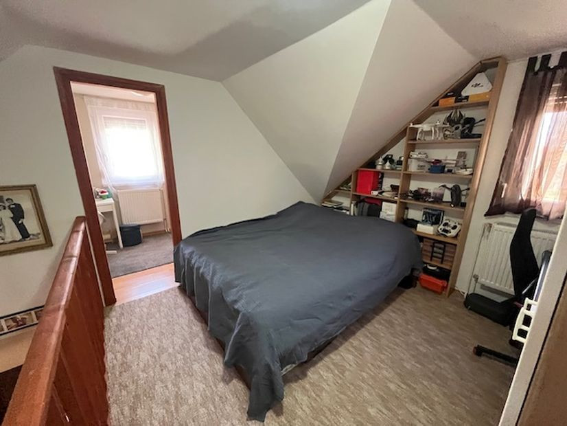 Tetőtérben: nappali (mely jelenleg a szülői hálószoba), 2 külön bejáratú szoba, loggia.