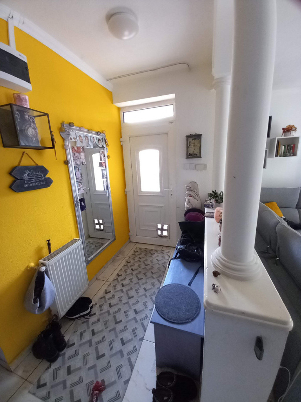 Alapvetően nappali és 3 hálós volt, azonban időközben az egyik szobát egységesítették a konyhával, ezáltal tágas. étkezős közösségi térré vált a konyha. Innen is és a nappaliból is egy-egy terasz nyílik az udvarra. A kert bár kicsi, kellő kényelmet nyújt a zöld felületekkel és a gyerekek számára játszótérrel.