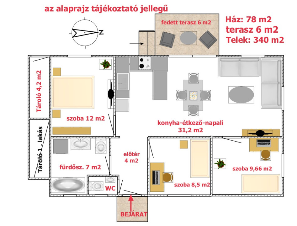 - Tájolás: Dél–nyugat (nappali és terasz)