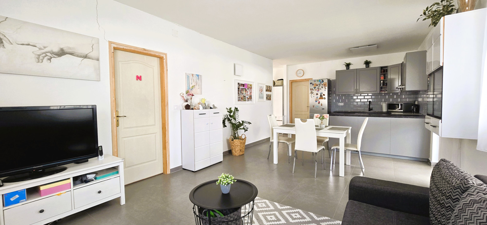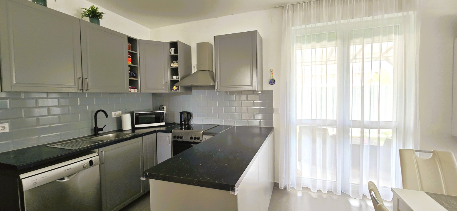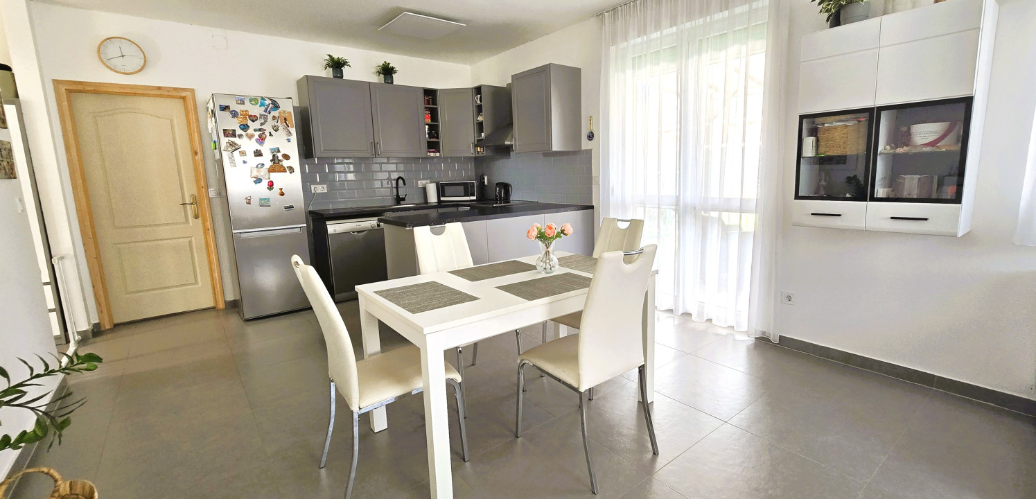A ház központi része a világos nappali–étkező–konyha, amely minőségi konyhabútorral és energiatakarékos beépített gépekkel felszerelt – a vételár részeként.