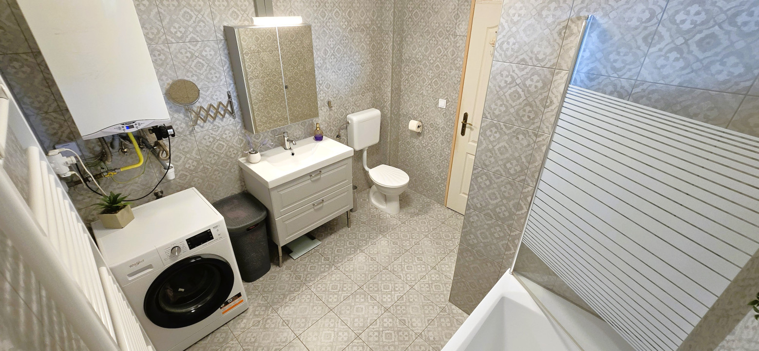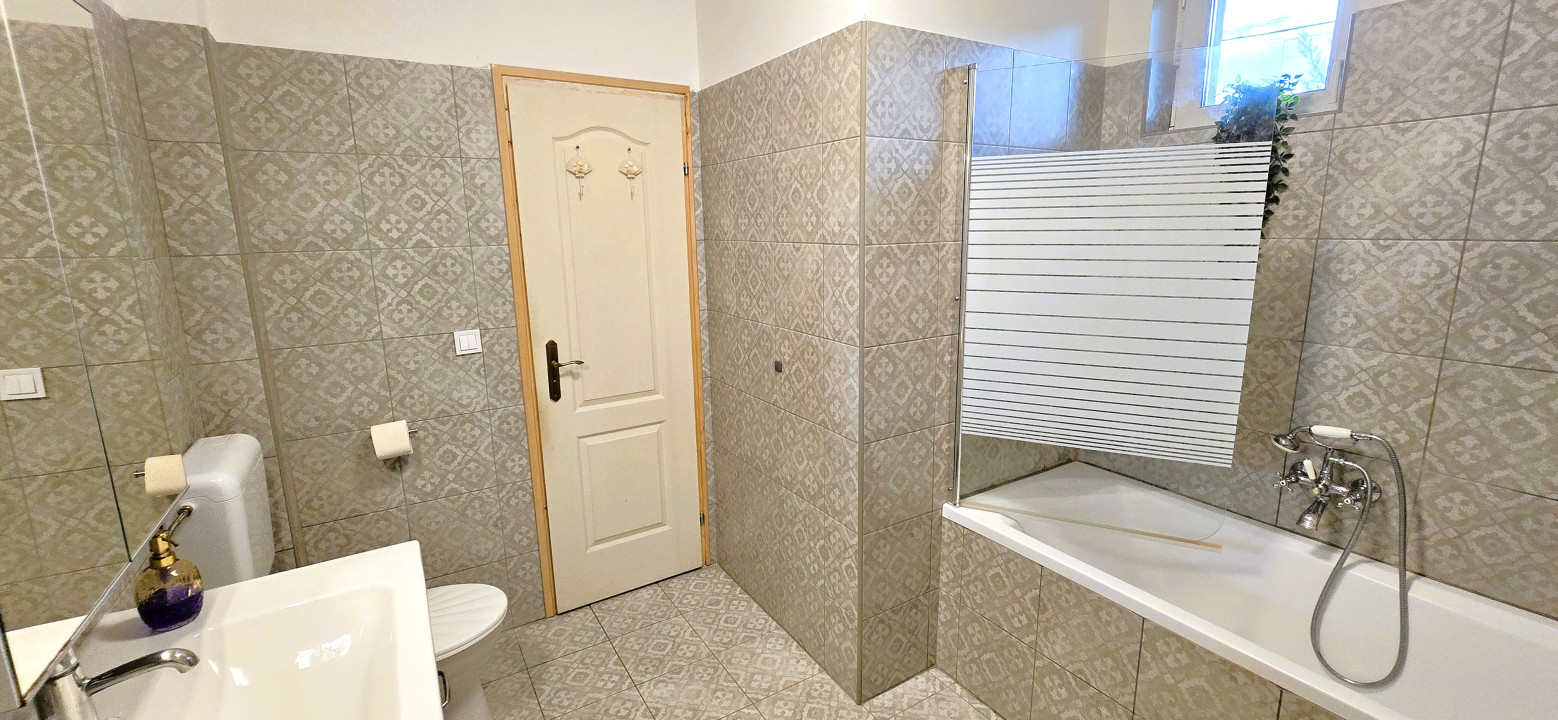 - Fürdőszoba (káddal, mosdóval, WC-vel): 7 m²