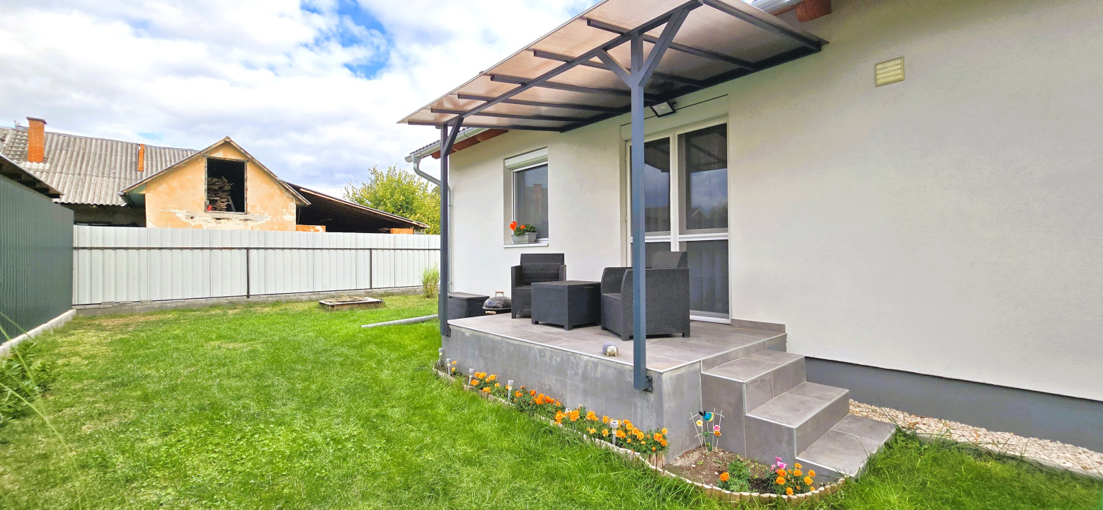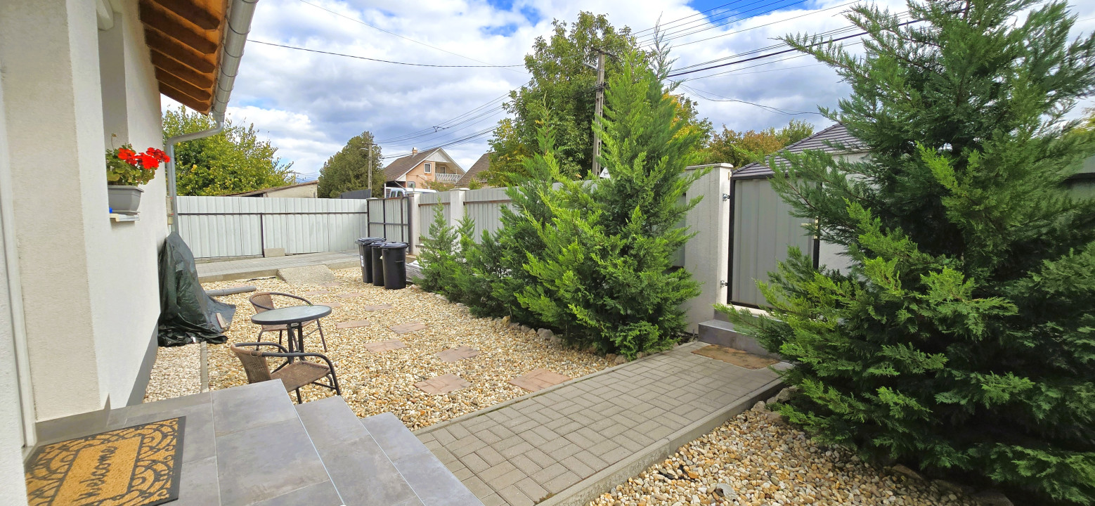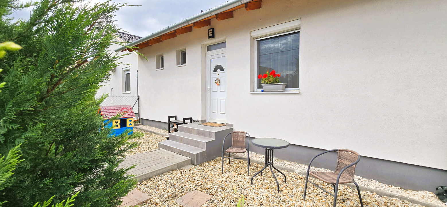 Eladásra kínálunk egy 2021-ben épült, nappali + 3 szobás, nettó 78 m² alapterületű földszintes ikerházat, 6 m²-es fedett terasszal és 340 m²-es telekkel.