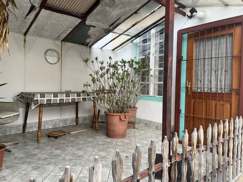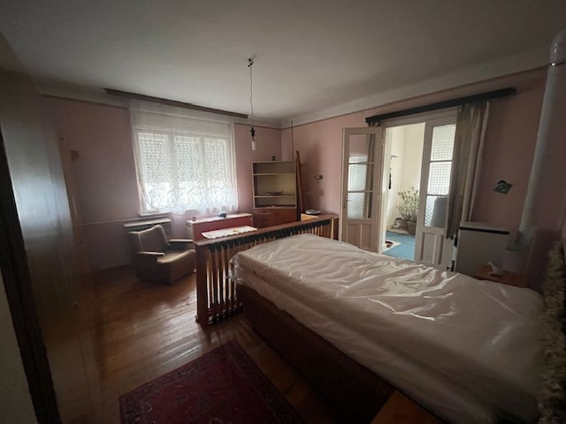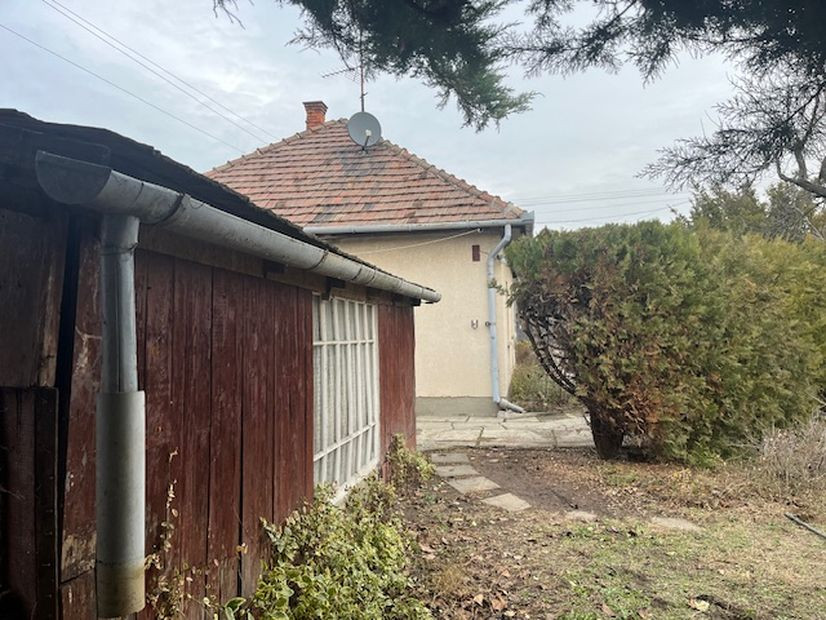 Elosztás:-fedett előterasz, előszoba, 2 külön bejáratú nagy szoba, közlekedő,kamra, fürdőszoba, étkezős konyha. Konyhából kijárat a hátsó fedett teraszra.