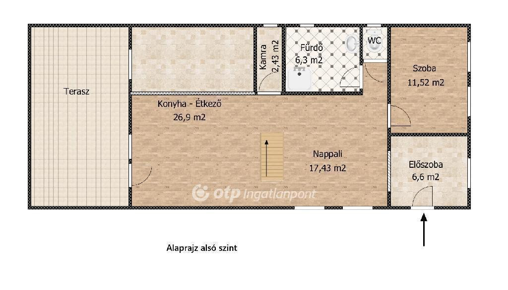 Az alsó szinten a tágas amerikaikonyhás nappalin kívül hálószoba is található, a felső szinten világos társalgó/nappali és 2 szoba került kialakításra.