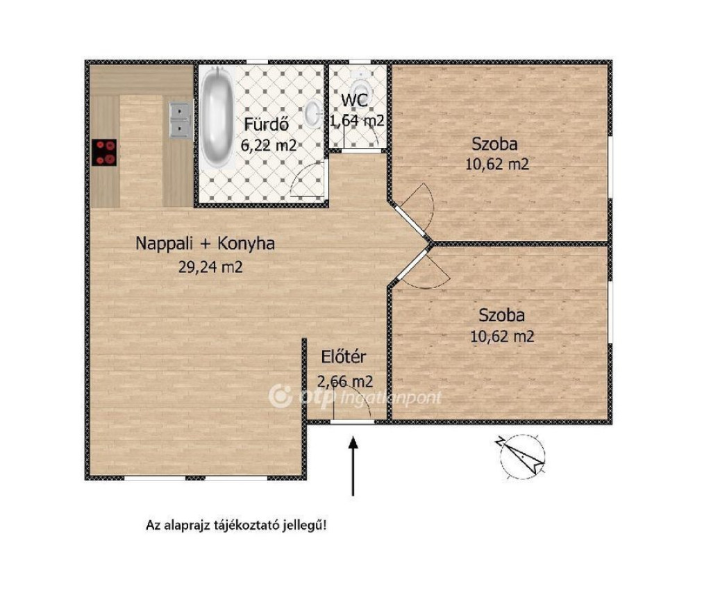 Az ingatlan elosztása praktikus, a nappali központi életteret ad, a külön nyíló szobák pedig ideálisak hálónak, gyerekszobának vagy dolgozónak is.