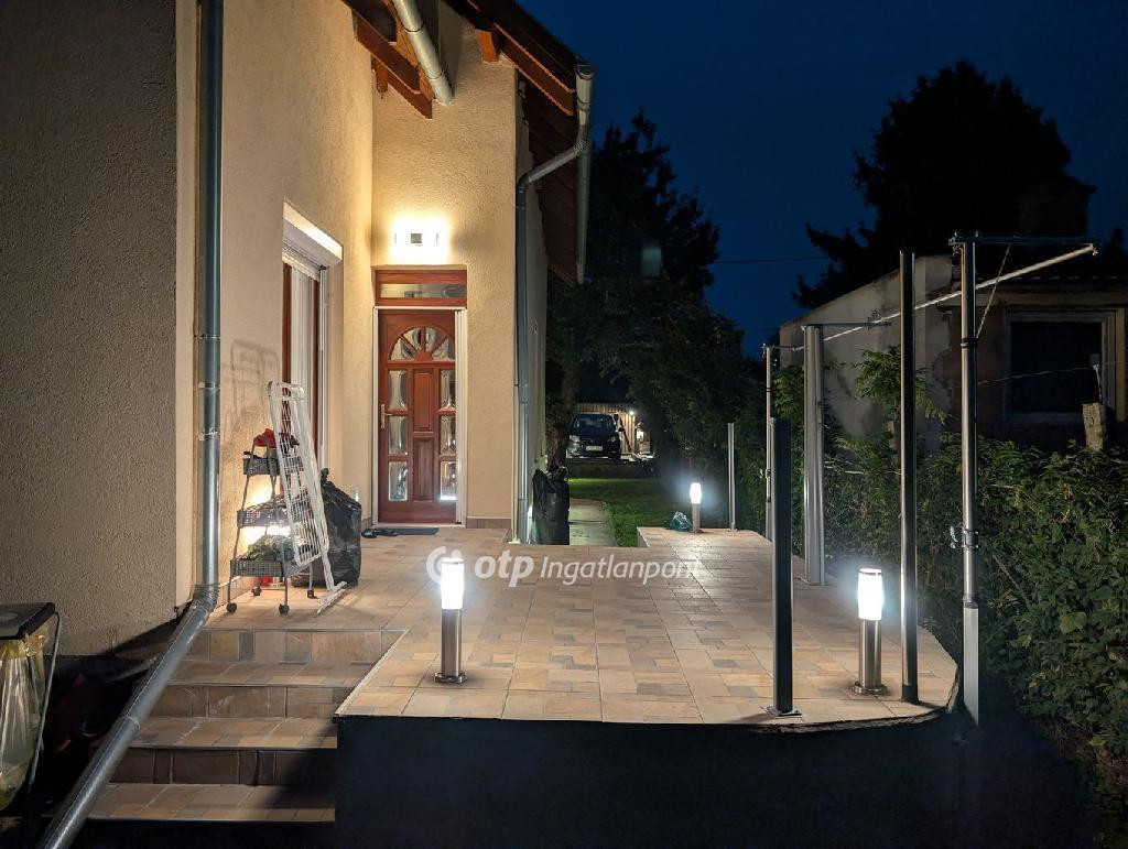 A telek körbejárható, külön előkerttel, a ház előtt pedig dupla nyitott kocsibeálló található.