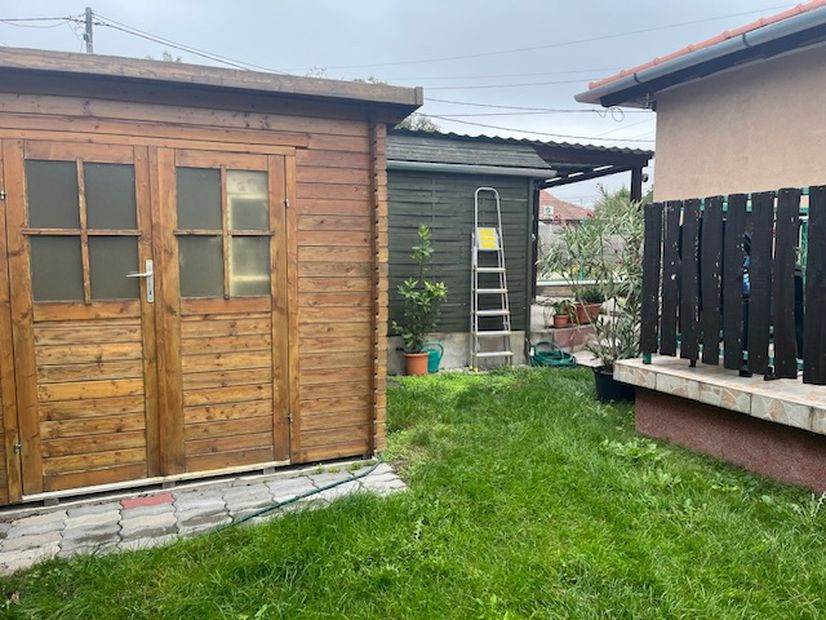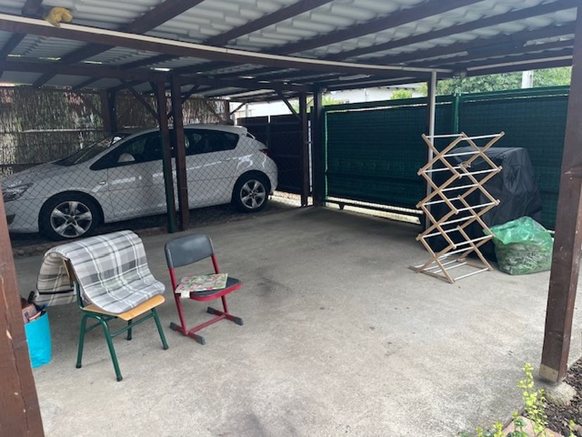 Előkertben fedett autóbeálló,hátsó és oldalsó kertben tárolók.