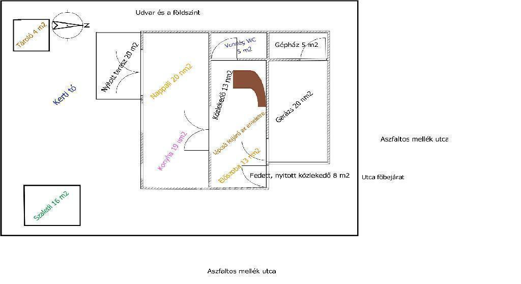 - Elrendezés földszint: amerikai konyhás nappali, előszoba, közlekedő, vendég WC, garázs.