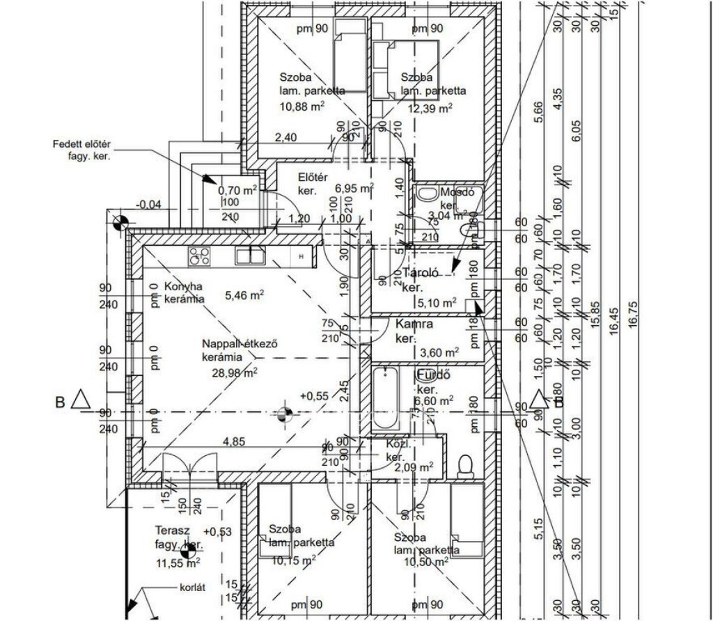 Az előszobából nyíló helyiségek két szoba, mosdó, háztartási helyiség , praktikus napi kényelmet adnak, míg a világos nappali,étkező,konyha a családi élet szíve. Innen elérhető egy kamra, valamint egy közlekedőn át további két hálószoba és egy kényelmes fürdőszoba.