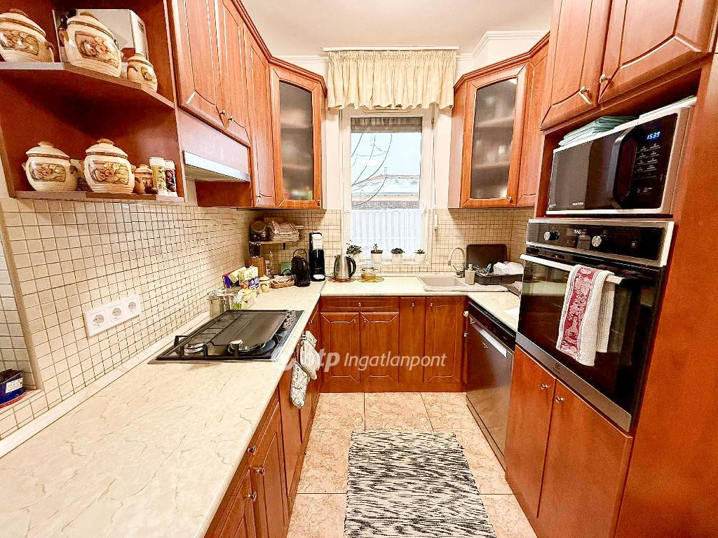 A gépesített konyhabútor a vételár részét képezi, praktikus kialakításának köszönhetően a mindennapi használatot maximálisan kiszolgálja. A nappaliból közvetlen kijárat nyílik a 18 nm-es teraszra, amely ideális helyszíne lehet családi étkezéseknek, pihenésnek vagy baráti összejöveteleknek.
